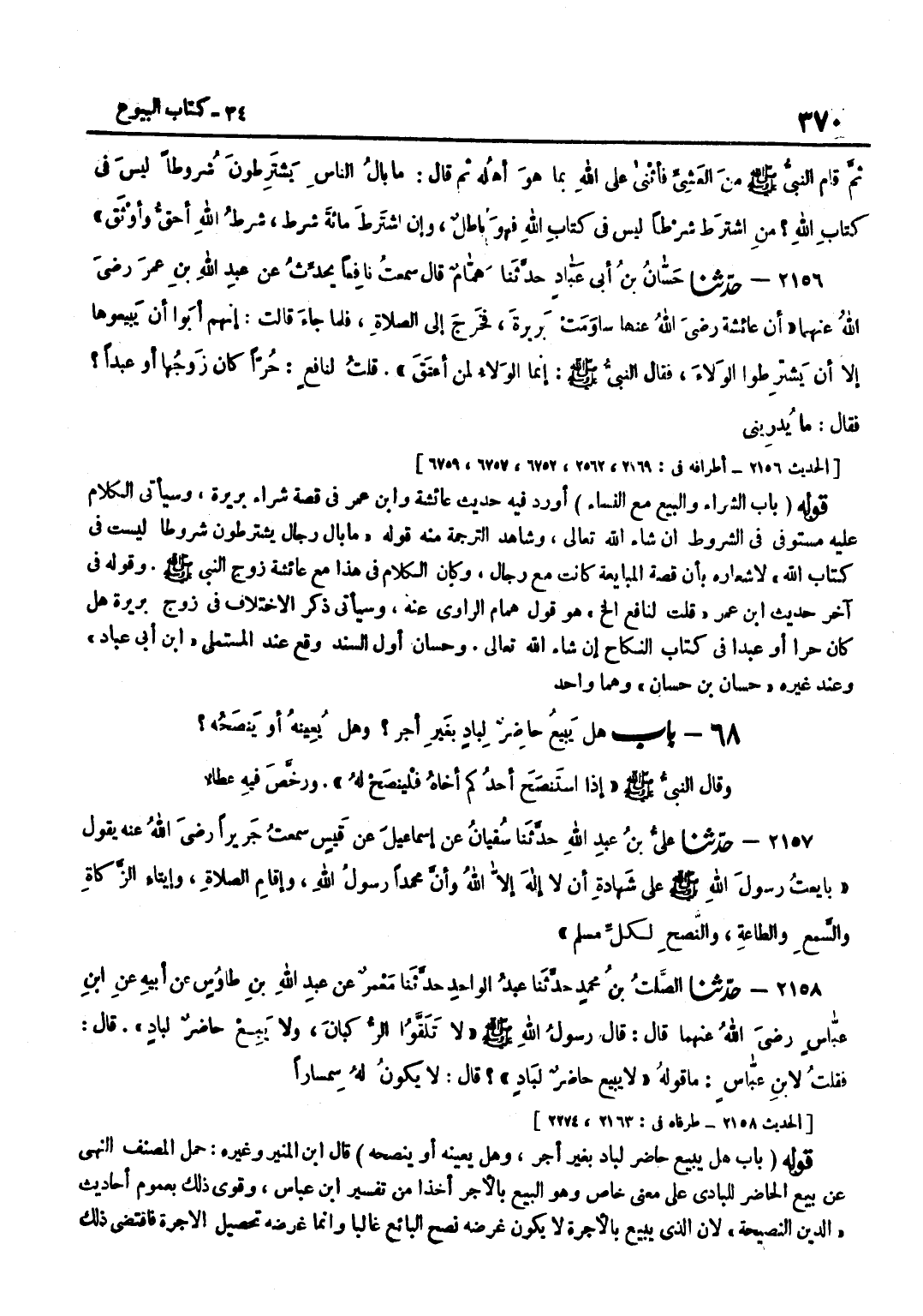أَوْرَدَ فِيهِ حَدِيث عَائِشَة وبن عُمَرَ فِي قِصَّةِ شِرَاءِ بَرِيرَةَ وَسَيَأْتِي الْكَلَامُ عَلَيْهِ مُسْتَوْفًى فِي الشُّرُوطِ إِنْ شَاءَ اللَّهُ تَعَالَى وَشَاهَدُ التَّرْجَمَةِ مِنْهُ