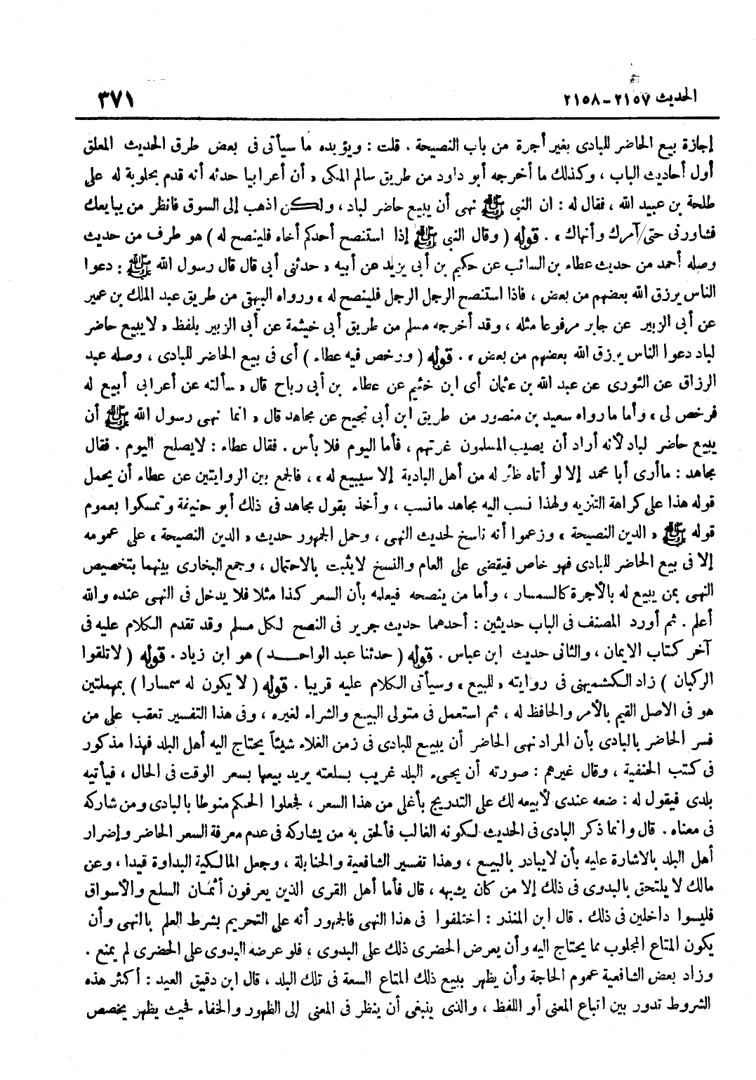 [2158] قَوْله حَدثنَا عبد الْوَاحِد هُوَ بن زِيَادٍ قَوْلُهُ لَا تَلَقَّوُا الرُّكْبَانَ زَادَ الْكُشْمِيهَنِيُّ فِي رِوَايَتِهِ لِلْبَيْعِ وَسَيَأْتِي الْكَلَامُ عَلَيْهِ قَرِيبًا قَوْلُهُ لَا يَكُونُ لَهُ سِمْسَارًا بِمُهْمَلَتَيْنِ هُوَ فِي الْأَصْلِ الْقَيِّمُ بِالْأَمْرِ وَالْحَافِظُ لَهُ ثُمَّ اسْتُعْمِلَ فِي مُتَوَلِّي الْبَيْعِ وَالشِّرَاءِ لِغَيْرِهِ وَفِي هَذَا التَّفْسِيرِ تَعَقُّبٌ عَلَى مَنْ فَسَّرَ الْحَاضِرَ بِالْبَادِي بِأَنَّ الْمُرَادَ نَهْيُ الْحَاضِرِ أَنْ يَبِيعَ لِلْبَادِي فِي زَمَنِ الْغَلَاءِ شَيْئًا يَحْتَاجُ إِلَيْهِ أَهْلُ الْبَلَدِ فَهَذَا مَذْكُورٌ فِي كُتُبِ الْحَنَفِيَّةِ وَقَالَ غَيْرُهُمْ صُورَتُهُ أَنْ يَجِيءَ الْبَلَدَ غَرِيبٌ بِسِلْعَتِهِ يُرِيدُ بَيْعَهَا بِسِعْرِ الْوَقْتِ فِي الْحَالِ فَيَأْتِيهِ بَلَدِيٌّ فَيَقُولُ لَهُ ضَعْهُ عِنْدِي لِأَبِيعَهُ لَكَ عَلَى التَّدْرِيجِ بِأَغْلَى مِنْ هَذَا السِّعْرِ فَجَعَلُوا الْحُكْمَ مَنُوطًا بِالْبَادِي وَمَنْ شَارَكَهُ فِي مَعْنَاهُ قَالَ وَإِنَّمَا ذُكِرَ الْبَادِي فِي الْحَدِيثِ لِكَوْنِهِ الْغَالِبَ فَأُلْحِقَ بِهِ مَنْ يُشَارِكُهُ فِي عَدَمِ مَعْرِفَةِ السِّعْرِ الْحَاضِرِ وَإِضْرَارِ أَهْلِ الْبَلَدِ بِالْإِشَارَةِ عَلَيْهِ بِأَنْ لَا يُبَادِرَ بِالْبَيْعِ وَهَذَا تَفْسِيرُ الشَّافِعِيَّةِ وَالْحَنَابِلَةِ وَجَعَلَ الْمَالِكِيَّةُ الْبَدَاوَةَ قَيْدًا وَعَنْ مَالِكٍ لَا يَلْتَحِقُ بِالْبَدَوِيِّ فِي ذَلِكَ إِلَّا مَنْ كَانَ يُشْبِهُهُ قَالَ فَأَمَّا أَهْلُ الْقُرَى الَّذِينَ يَعْرِفُونَ أَثْمَانَ السِّلَعِ وَالْأَسْوَاقِ فَلَيْسُوا داخلين فِي ذَلِك قَالَ بن الْمُنْذِرِ اخْتَلَفُوا فِي هَذَا النَّهْيِ فَالْجُمْهُورُ أَنَّهُ عَلَى التَّحْرِيمِ بِشَرْطِ الْعِلْمِ بِالنَّهْيِ وَأَنْ يَكُونَ الْمَتَاعُ الْمَجْلُوبُ مِمَّا يُحْتَاجُ إِلَيْهِ وَأَنْ يَعْرِضَ الْحَضَرِيُّ ذَلِكَ عَلَى الْبَدَوِيِّ فَلَوْ عَرَضَهُ الْبَدَوِيُّ عَلَى الْحَضَرِيِّ لَمْ يُمْنَعْ وَزَادَ بَعْضُ الشَّافِعِيَّةِ عُمُومَ الْحَاجَةِ وَأَنْ يَظْهَرَ بِبَيْعِ ذَلِكَ الْمَتَاعِ السعَة فِي تِلْكَ الْبَلَد قَالَ بن دَقِيقِ الْعِيدِ أَكْثَرُ هَذِهِ الشُّرُوطِ تَدُورُ بَيْنَ اتِّبَاعِ الْمَعْنَى أَوِ اللَّفْظِ وَالَّذِي يَنْبَغِي أَنْ يُنْظَرَ فِي الْمَعْنَى إِلَى الظُّهُورِ وَالْخَفَاءِ فَحَيْثُ يظْهر يخصص