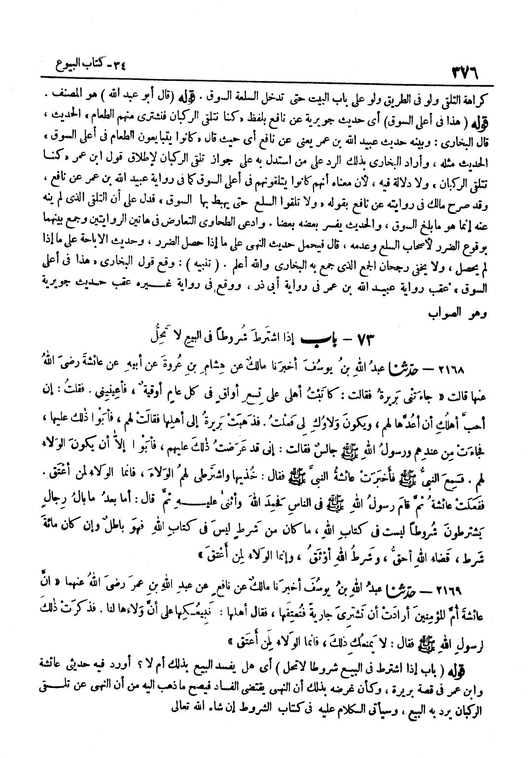 أَيْ هَلْ يَفْسُدُ الْبَيْعُ بِذَلِكَ أم لَا أورد فِيهِ حَدِيثي عَائِشَة وبن عُمَرَ فِي قِصَّةِ بَرِيرَةَ وَكَأَنَّ غَرَضَهُ بِذَلِكَ أَنَّ النَّهْيَ يَقْتَضِي الْفَسَادَ فَيَصِحُّ مَا ذَهَبَ إِلَيْهِ مِنْ أَنَّ النَّهْيَ عَنْ تَلَقِّي الرُّكْبَانِ يُرَدُّ بِهِ الْبَيْعُ وَسَيَأْتِي الْكَلَامُ عَلَيْهِ فِي كِتَابِ الشُّرُوطِ إِنْ شَاءَ اللَّهُ تَعَالَى