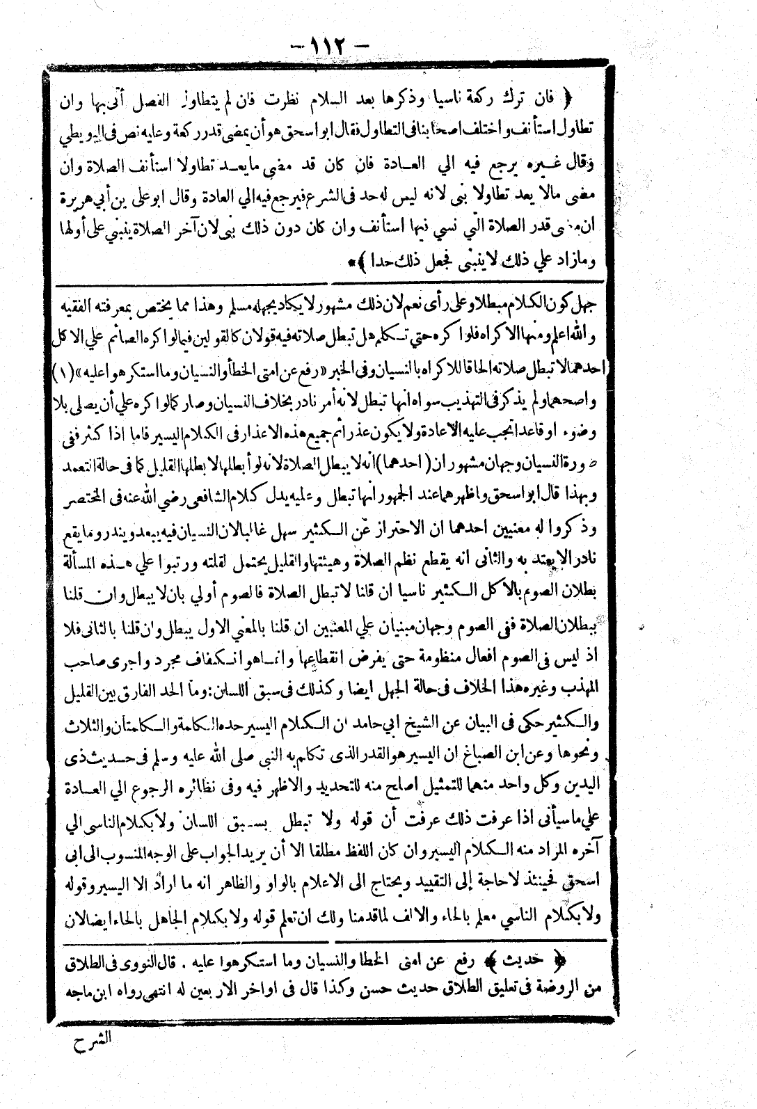 جهل كون الكلام مبطلا وعلى رأى نعم لان ذلك مشهور لا يكاد يجهله مسلم وهذا مما يختص بمعرفته الفقيه والله اعلم ومنها الاكراه فلو اكره حتي تكلم هل تبطل صلاته فيه قولان كالقولين فيما لو اكره الصائم علي الاكل احدهما لا تبطل صلاته الحاقا للاكراه بالنسيان وفى الخبر " رفع عن امتى الخطأ والنسيان وما استكرهوا عليه " واصحهما ولم يذكر في التهذيب سواه انها تبطل لانه أمر نادر بخلاف النسيان وصار كما لو اكره علي أن يصلى بلا وضوء أو قاعدا تجب عليه الاعادة ولا يكون عذرا ثم جميع هذه الاعذار في الكلام اليسير فاما إذا كثر ففى صورة النسيان وجهان مشهوران (احدهما) انه لا يبطل الصلاة لانه لو أبطلها لابطلها القليل كما في حالة التعمد وبهذا قال أبو اسحق واظهرهما عند الجمهور انها تبطل وعليه يدل كلام الشافعي رضي الله عنه في المختصر وذكروا له معنيين احدهما ان الاحتراز عن الكثير سهل غالبا لان النسيان فيه يبعد ويندر وما يقع نادرا لا يعتد به والثانى انه يقطع نظم الصلاة وهيئتها والقليل يحتمل لقلته ورتبوا علي هذه المسألة بطلان الصوم بالاكل الكثير ناسيا ان قلنا لا تبطل الصلاة فالصوم أولي بان لا يبطل وان قلنا ببطلان الصلاة ففى الصوم وجهان مبنيان علي المعنبين ان قلنا بالمعني الاول يبطل وان قلنا بالثاني فلا إذ ليس في الصوم افعال منظومة حتى يفرض انقطاعها وانما هو انكفاف مجرد واجري صاحب المهذب وغيره هذا الخلاف في حالة الجهل ايضا وكذلك في سبق اللسان: وما الحد الفارق بين القليل والكثير حكى في البيان عن الشيخ ابي حامد ان الكلام اليسير حده الكلمة والكلمتان والثلاث ونحوها وعن ابن الصباغ ان اليسير هو القدر الذى تكلم به النبي صلى الله عليه وسلم في حديث ذى اليدين وكل واحد منهما للتمثيل اصلح منه للتحديد والاظهر فيه وفى نظائره الرجوع الي العادة علي ما سيأنى إذا عرفت ذلك عرفت أن قوله ولا تبطل بسبق اللسان ولا بكلام الناسي الي آخره المراد منه الكلام اليسير وان كان اللفظ مطلقا الا أن يريد الجواب على الوجه المنسوب إلى ابى اسحق فحينئذ لا حاجة إلى التقييد ويحتاج إلى الاعلام بالواو والظاهر انه ما اراد الا اليسير وقوله ولا بكلام الناسي معلم بالحاء والالف لما قدمنا ولك ان تعلم قوله ولا بكلام الجاهل بالحاء ايضا لان