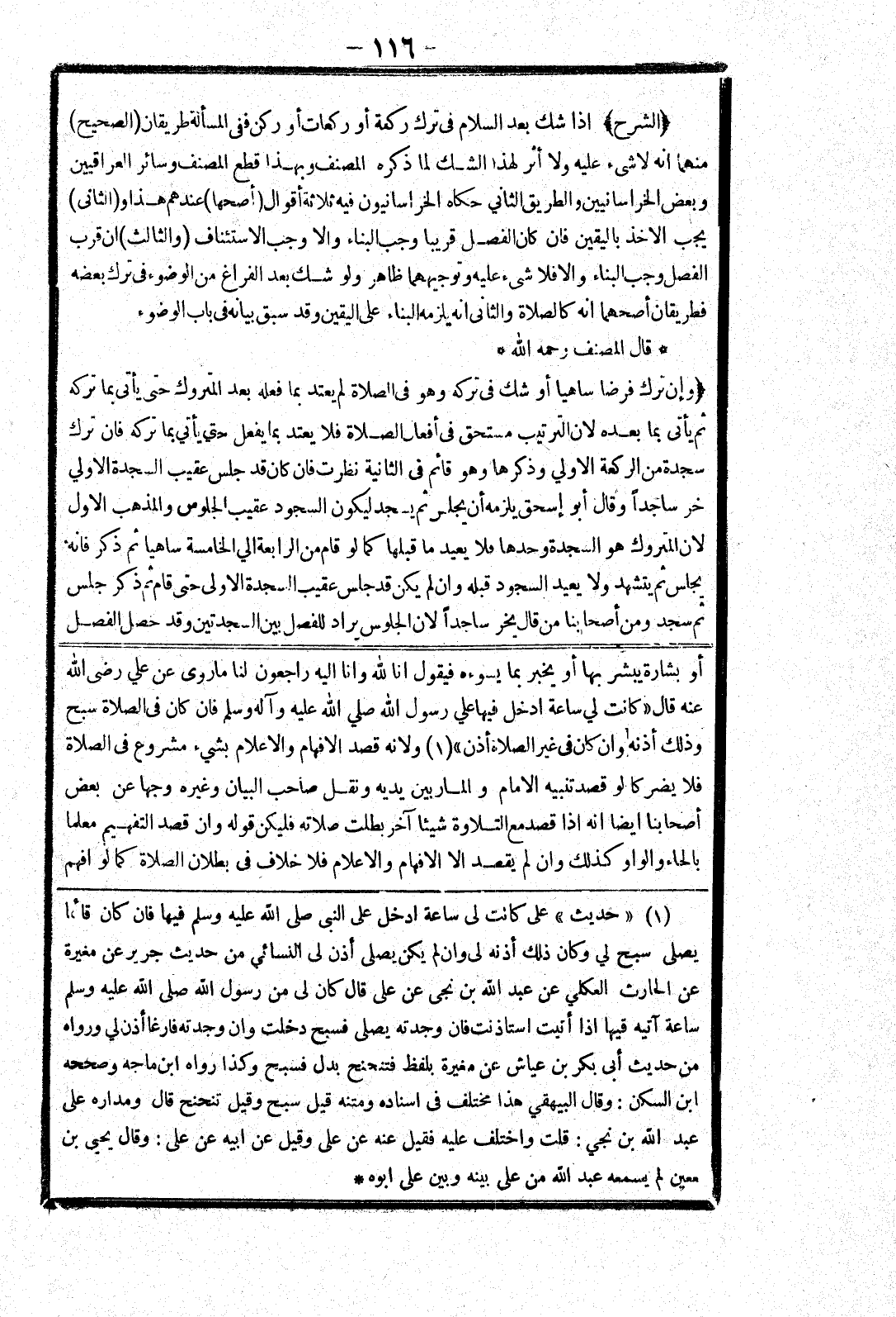 أو بشارة يبشر بها أو يخبر بما يسوءه فيقول انا لله وانا إليه راجعون لنا ما روى عن علي رضى الله عنه قال " كانت لي ساعة ادخل فيها علي رسول الله صلي الله عليه وسلم فان كان في الصلاة سبح وذلك أذنه وان كان في غير الصلاة أذن " ولانه قصد الافهام والاعلام بشئ مشروع في الصلاة فلا يضر كما لو قصد تنبيه الامام والمار بين يديه ونقل صاحب البيان وغيره وجها عن بعض أصحابنا ايضا انه إذا قصد مع التلاوة شيئا آخر بطلت صلاته فليكن قوله وان قصد التفهيم معلما بالحاء والواو كذلك وان لم يقصد الا الافهام والاعلام فلا خلاف في بطلان الصلاة كما لو افهم