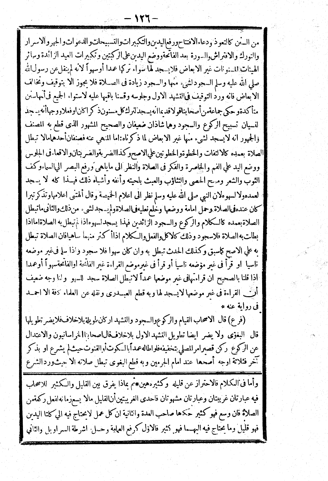 وأما في الكلام فالاحتراز عن قليله وكثيره هين * ثم بماذا يفرق بين القليل والكثير للاصحاب فيه عبارتان غريبتان وعبارتان مشهورتان فاحدى الغريبتين أن القليل مالا يسع زمانه لفعل ركعة من الصلاة فان وسع فهو كثير حكاها صاحب العدة والثانية ان كل عمل لا يحتاج فيه الي كلتا اليدين فهو قليل وما يحتاج فيه اليهما فهو كثير فالاول كرفع العمامة وحل اشرطة السراويل والثاني