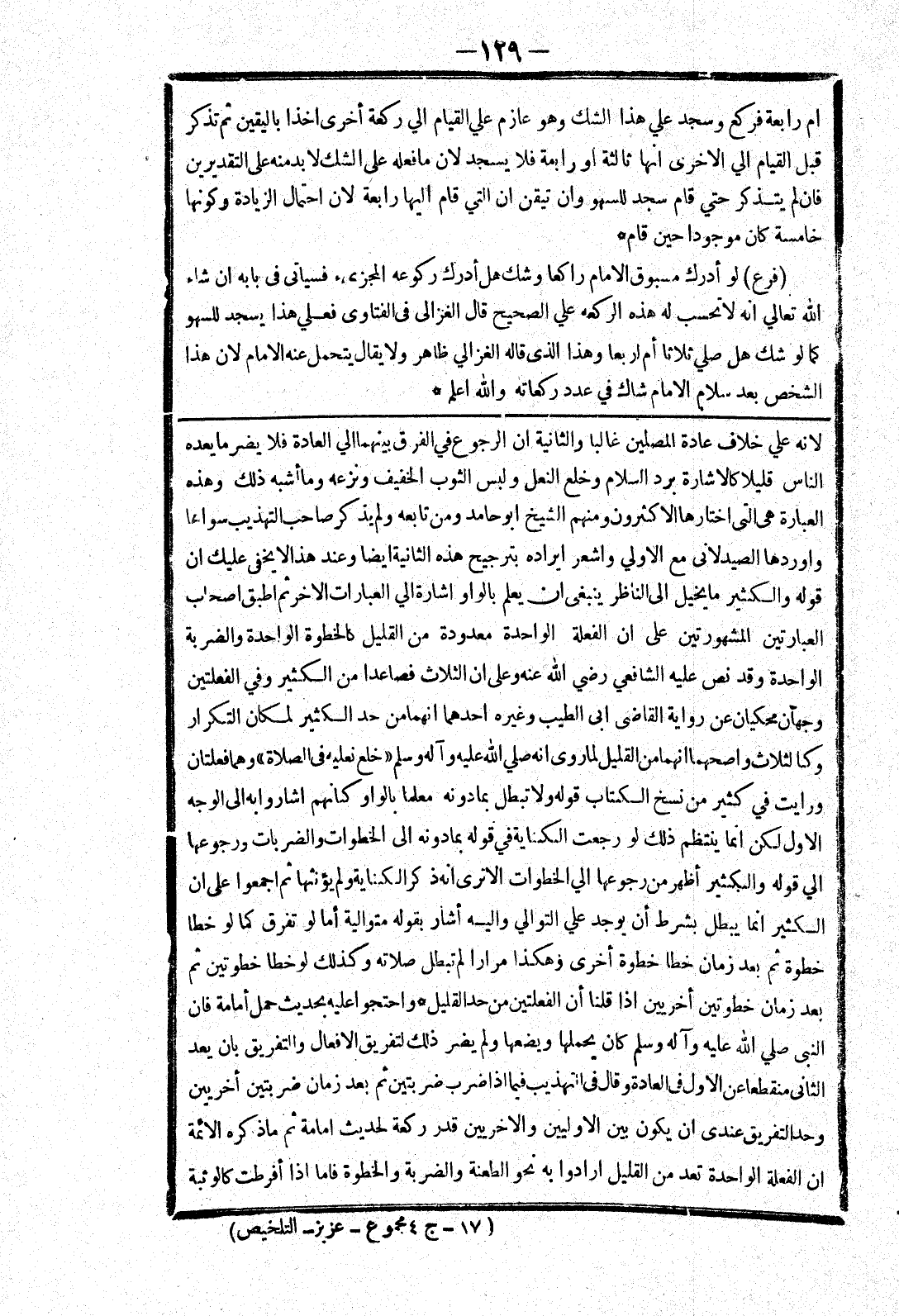 لانه علي خلاف عادة المصلين غالبا والثانية ان الرجوع في الفرق بينهما الي العادة فلا يضر ما يعده الناس قليلا كالاشارة برد السلام وخلع النعل ولبس الثوب الخفيف ونزعه وما أشبه ذلك وهذه العبارة هي التى اختارها الاكثرون ومنهم الشيخ أبو حامد ومن تابعه ولم يذكر صاحب التهذيب سواها واوردها الصيدلانى مع الاولي واشعر ايراده بترجيح هذه الثانية ايضا وعند هذا لا يخفى عليك ان قوله والكثير ما يخيل إلى الناظر وينبغى ان يعلم بالواو اشارة الي العبارات الاخر ثم اطبق اصحاب العبارتين المشهورتين على ان الفعلة الواحدة معدودة من القليل كالخطوة الواحدة والضربة