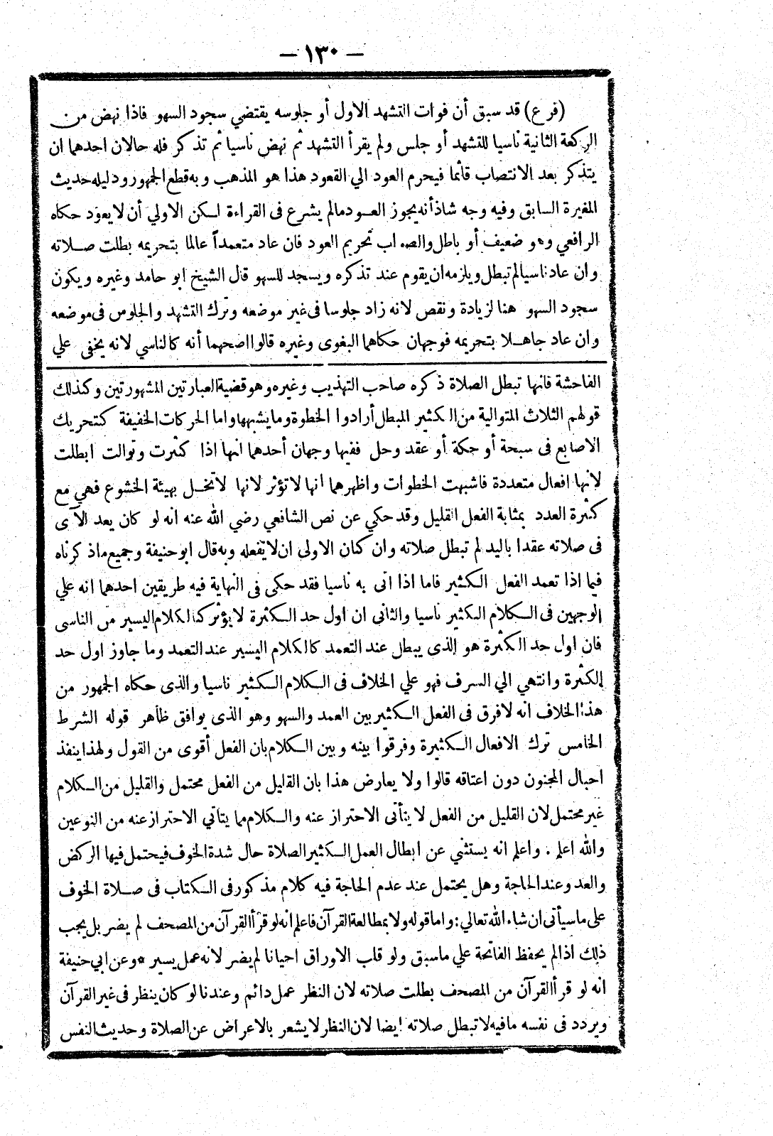 فان اول حد الكثرة هو الذى يبطل عند التعمد كالكلام اليسير عند التعمد وما جاوز اول حد الكثرة وانتهي الي السرف فهو علي الخلاف في الكلام الكثير ناسيا والذى حكاه الجمهور من هذا الخلاف انه لا فرق في الفعل الكثير بين العمد والسهو وهو الذى يوافق ظاهر قوله الشرط الخامس ترك الافعال الكثيرة وفرقوا بينه وبين الكلام بان الفعل أقوى من القول ولهذا ينفذ احبال الجنون دون اعتاقه قالوا ولا يعارض هذا بان القليل من الفعل محتمل والقليل من الكلام غير محتمل لان القليل من الفعل لا يتأتى الاحتراز عنه والكلام مما يتاتي الاحتراز عنه من النوعين والله اعلم.