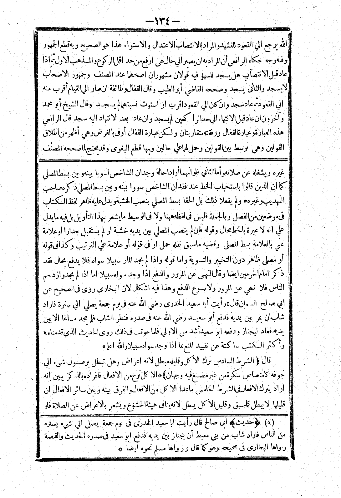 عني بالعلامة بسط المصلى وقضيه ما سبق نقله حمل أو في قوله أو علامة علي الترتيب وكذا في قوله أو مصلى ظاهر دون التخيبر والتسوية واما قوله وإذا لم يجد الماء سبيلا سواه فلا يدفع بحال فقد ذكر امام الحرمين ايضا وقال النهى عن المرور والدفع إذا وجد سواه سبيلا اما إذا لم يجد وازدحم الناس فلا نهي عن المرور ولا يسوع الدفع وهذا فيه اشكال لان البخاري روى في الصحيح عن ابي صالح السمان قال " رأيت أبا سعيد الخدرى رضي الله عنه في يوم جمعة يصلي الي سترة فاراد شاب ان يمر بين يديه فدفع أبو سعيد رضي الله عنه في صدره فنظر الشاب فلم يجد مساغا الا بين يديه فعاد ليجتاز ودفعه أبو سعيد أشد من الاولي فلما عوتب في ذلك روى الحديث الذى قدمناه " وأكثر الكتب ساكتة عن تقييد المنع بما إذا وجد سواه سبيلا والله اعلم * قال (الشرط السادس ترك الاكل وقليله مبطل لانه اعراض وهل تبطل بوصول شئ الي جوفه كامتصاص سكرة من غيره مضغ فيه وجهان) * الا كل نوع من الافعال فافراده بالذكر يبين انه اراد بترك الافعال في الشرط الخامس ما عدا الاكل من الافعال والفرق بينه وبين سائر الافعال ان قليلها لا يبطل كما سبق وقليل الاكل يبطل لانه ينافى هيئة الخشوع ويشعر بالاعراض عن الصلاة فلو