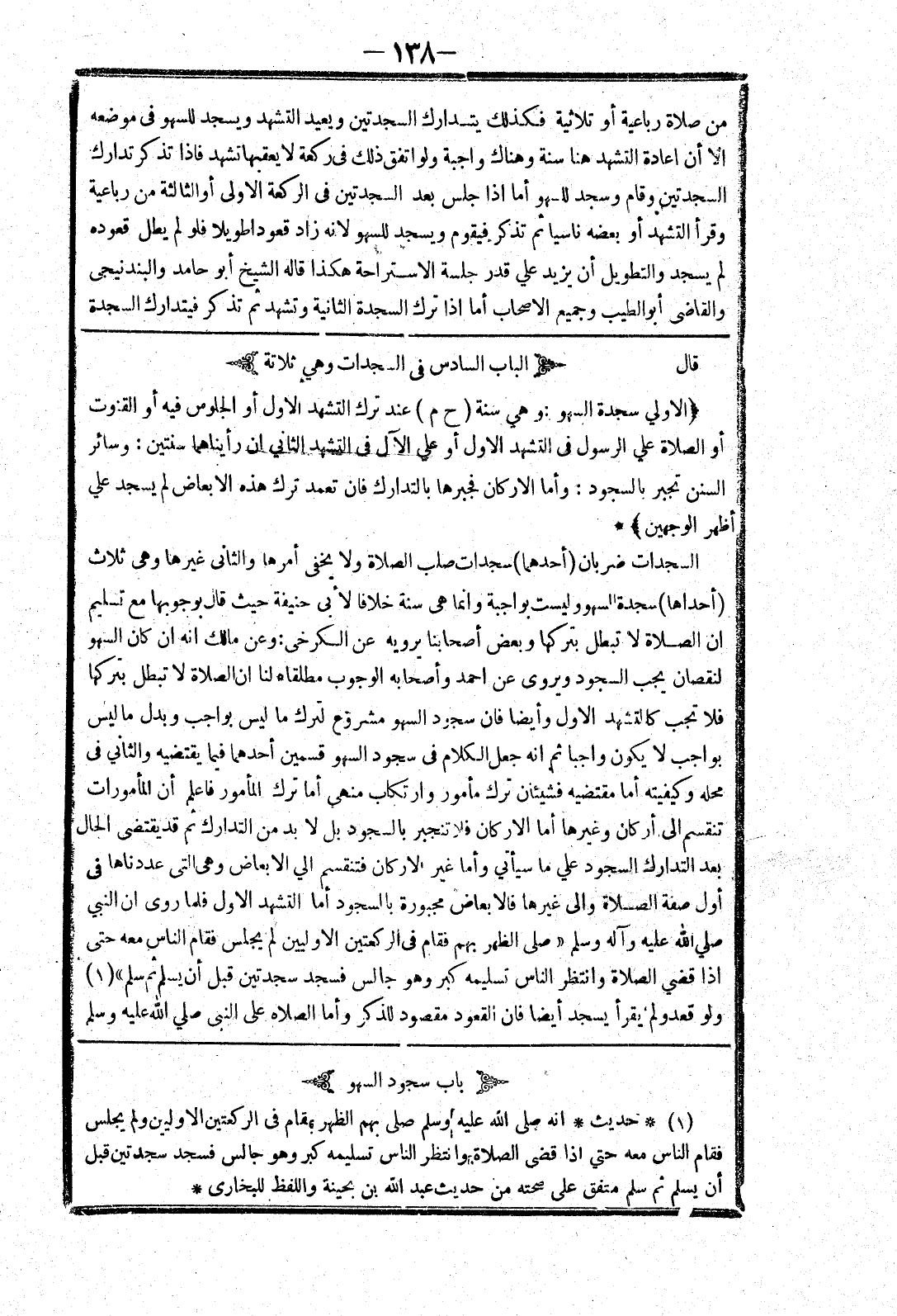 أو الصلاة علي الرسول في التشهد الاول أو علي الآل في التشهد الثاني ان رأيناهما سنتين: وسائر السنن لا تجبر بالسجود: وأما الاركان فجبرها بالتدارك فان تعمد ترك هذه الابعاض لم يسجد علي أظهر الوجهين) * السجدات ضربان (أحدهما) سجدات صلب الصلاة ولا يخفى أمرها والثانى غيرها وهى ثلاث (أحداها) سجدة للسهو وليست بواجبة وانما هي سنة خلافا لابي حنيفة حيث قال بوجوبها مع تسليم ان الصلاة لا تبطل بتركها وبعض أصحابنا يرويه عن الكرخي: وعن مالك انه ان كان السهو لنقصان يجب السجود ويروى عن احمد وأصحابه الوجوب مطلقا * لنا ان الصلاة لا تبطل بتركها فلا تجب كالتشهد الاول وأيضا فان سجود السهو مشروع لترك ما ليس بواجب وبدل ما ليس بواجب لا يكون واجبا ثم انه جعل الكلام في سجود السهو قسمين أحدهما فيما يقتضيه والثاني في محله وكيفيته أما مقتضيه فشيئان ترك مأمور وارتكاب منهى أما ترك المأمور فاعلم أن المأمورات تنقسم إلى أركان وغيرها أما الاركان فلا تنجبر بالسجود بل لا بد من التدارك ثم قد يقتضى الحال بعد التدارك السجود علي ما سيأتي وأما غير الاركان فتنقسم الي الابعاض وهى التى عددناها في أول صفة الصلاة والى غيرها فالابعاض مجبورة بالسجود أما التشهد الاول فلما روى ان النبي صلي الله عليه وسلم " صلى الظهر بهم فقام في الركعتين الاوليين لم يجلس فقام الناس معه حتى إذا قضي الصلاة وانتظر الناس تسليمه كبر وهو جالس فسجد سجدتين قبل أن يسلم ثم سلم " ولو قعد ولم يقرأ يسجد أيضا فان القعود مقصود للذكر وأما الصلاة على النبي صلي الله عليه وسلم