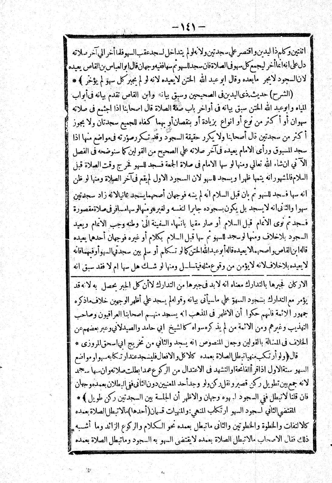 الاركان فجبرها بالتدارك معناه انه لا بد في جبرها من التدارك لا أن كل الجبر يحصل به لانه قد يؤمر مع التدارك بسجود السهو علي ما سيأتي بيانه وقوله لم يسجد علي أظهر الوجهين خلاف ما ذكره جمهور الائمة فانهم حكوا أن الاظهر في المذهب انه يسجد منهم اصحابنا العراقيون وصاحب التهذيب وغيرهم ومن الائمة من لم يذكره سواه كالشيخ ابي حامد والصيدلاني وعبر بعضهم عن الخلاف في المسالة بالقولين وجعل المنصوص انه يسجد والثاني من تخريج ابي اسحق المروزى * قال (ولو أرتكب منهيا تبطل الصلاة بعمده كالاكل والافعال فليسجد عند ارتكابه سهوا ومواضع السهو ستة الاول إذا قرأ الفاتحة أو التشهد في الاعتدال من الركوع عمدا بطلت صلاته وان سها سجد لانه جمع بين تطويل ركن قصير ونقل ركن ولو وجد أحد المعنيين دون الثاني ففى البطلان بعمده وجهان فان قلنا لا تبطل ففي السجود لسهوه وجهان والاظهر أن الجلسة بين السجدتين ركن طويل) * المقتضي الثاني لسجود السهو ارتكاب المنهي: والمنهيات قسمان (أحدها) مالا تبطل الصلاة بعمده كالالتفات والخطوة والخطوتين والثانى ما تبطل بعمده نحو الكلام والركوع الزائد وما أشبه ذلك فقال الاصحاب مالا تبطل بعمده لا يقتضى السهو به السجود وما تبطل الصلاة بعمده