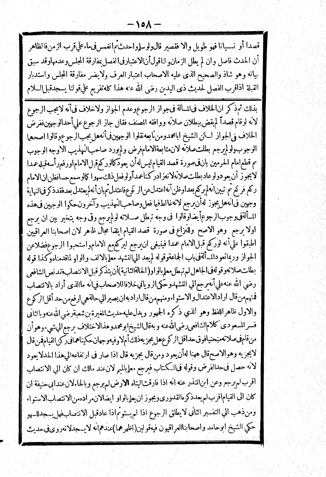 أو لا يرجع وهو الاصح وللنزاع في صورة قصد القيام ايضا مجال ظاهر لان اصحابنا العراقيين اطبقوا علي أنه لو ركع قبل الامام عمدا فينبغي ان يرجع ليرجع مع الامام واستحبوا الرجوع فضلا عن الجواز وربما تعود المسألة في باب الجماعة وقوله لم يعد الي التشهد معلم بالالف والواو لما قدمناه وكذا قوله بطلت صلاته وقوله في الجاهل لم تبطل معلم بالواو (الحالة الثانية) أن يتذكر قبل الانتصاب فقد نص الشافعي رضي الله عنه علي أنه يرجع الي التشهد وحكى الروياني خلافا للاصحاب في انه ما الذى أراد بالانتصاب فمنهم من قال اراد الاعتدال والاستواء ومنهم من قال اراد به ان يصير الي حالة هي ارفع من حد أقل الركوع والاول ظاهر اللفظ وهو الذي ذكره الجمهور ويدل عليه حديث المغيرة بن شعبة رضي الله عنه وبالثانى فسر المسعودي كلام الشافعي رضى الله عنه وبه قال الشيخ أبو محمد وهذا لاختلاف يرجع الي شئ وهو أن من قام في صلاته منحنيا فوق حد اقل الركوع هل يجزيه ذلك أم لا وفيه وجهان حكيناهما في ركن القيام فمن قال لا يجزيه وهو الاصح قال ههنا له أن يعود ومن قال يجزيه قال إذا صار في ارتفاعه الي هذا الحد لا يعود لانه حصل في حد الفرض وقوله في الكتاب فيرجع معلم بالميم لان عند مالك ان كان الي الانتصاب اقرب لم يرجع وعن ابن المنذر عنه انه إذا فارقت اليتاه الارض لم يرجع وبالحاء لان عند ابى حنيفة ان كان إلى القيام اقرب لم يعد ذكره القدورى ويجوز ان يعلم بالواو ايضا لان مراده من الانتصاب الاستواء ومن ذهب الي التفسير الثاني لا يطلق الرجوع إذا لم يستو ثم إذا عاد قبل الانتصاب فهل يسجد للسهو حكي الشيخ أبو حامد واصحابنا العراقيون فيه قولين (اظهرهما) عندهم انه لا يسجد لانه روى في حديث