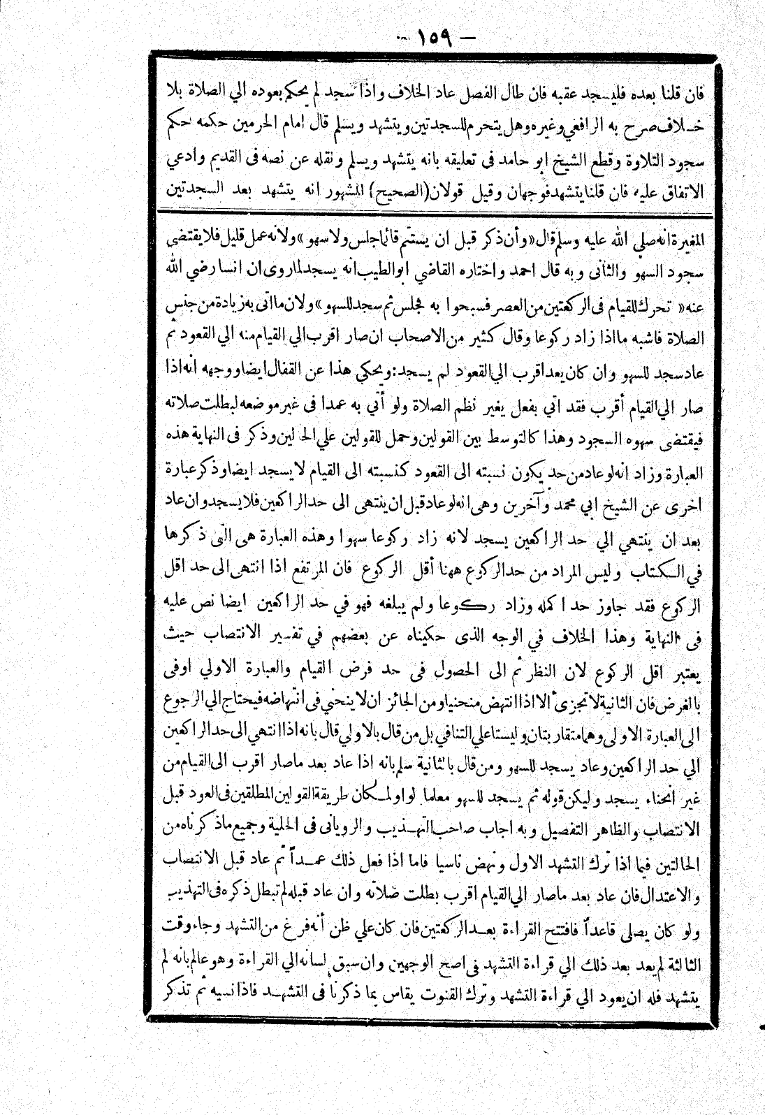 فيقتضى سهوه السجود وهذا كالتوسط بين القولين وحمل للقولين علي الحالين وذكر في النهاية هذه العبارة وزاد انه لو عاد من حد يكون نسبته إلى القعود كنسبته إلى القيام لا يسجد ايضا وذكره عبارة اخرى عن الشيخ ابي محمد وآخرين وهى انه لو عاد قبل ان ينتهى إلى حد الراكعين فلا يسجد وان عاد بعد ان ينتهي الي حد الراكعين يسجد لانه زاد ركوعا سهوا وهذه العبارة هي التى ذكرها في الكتاب وليس المراد من حد الركوع ههنا أقل الركوع فان المرتفع إذا انتهى إلى حد اقل الركوع فقد جاوز حد اكمله وزاد ركوعا ولم يبلغه فهو في حد الراكعين ايضا نص عليه في النهاية وهذا الخلاف في الوجه الذى حكيناه عن بعضهم في تفسير الانتصاب حيث يعتبر اقل الركوع لان النظر ثم إلى الحصول في حد فرض القيام والعبارة الاولي اوفى بالغرض فان الثانية لا تجزئ الا إذا انتهض منحنيا ومن الجائز ان لا ينحني في انتهاضه فيحتاج الي الرجوع إلى العبارة الاولى وهما متقاربتان وليستا علي التنافي بل من قال بالاولي قال بانه إذا انتهي إلى حد الراكعين الي حد الراكعين وعاد يسجد للسهو ومن قال بالثانية سلم بانه إذا عاد بعدما صار اقرب إلى القيام من غير انحناء يسجد وليكن قوله ثم يسجد للسهو معلما لواو لمكان طريقة القولين المطلقين في العود قبل الانتصاب والظاهر التفصيل وبه اجاب صاحب التهذيب والرويانى في الحلية وجميع ما ذكرناه من الحالتين فيما إذا ترك التشهد الاول ونهض ناسيا فاما إذا فعل ذلك عمدا ثم عاد قبل الانتصاب والاعتدال فان عاد بعدما صار الي القيام اقرب بطلت صلاته وان عاد قبله لم تبطل ذكره في التهذيب ولو كان يصلى قاعدا فافتتح القراءة بعد الركعتين فان كان علي ظن أنه فرغ من التشهد وجاء وقت الثالثة لم يعد بعد ذلك الي قراءة التشهد في اصح الوجهين وان سبق لسانه الي القراءة وهو عالم بانه لم يتشهد فله ان يعود الي قراءة التشهد وترك القنوت يقاس بما ذكرنا في التشهد فإذا نسيه ثم تذكر