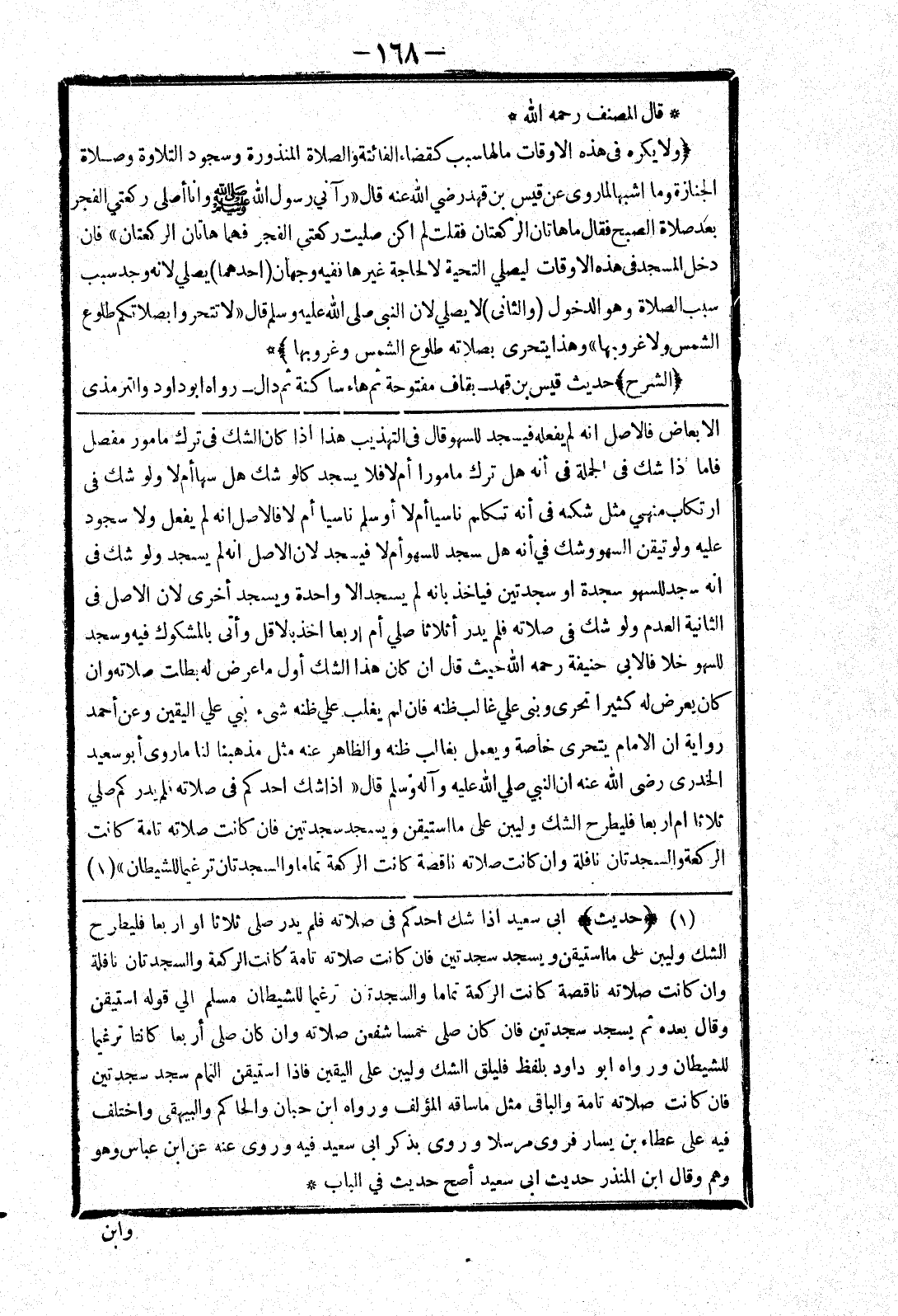 للسهو خلافا لابي حنيفة رحمه الله حيث قال ان كان هذا الشك أول ما عرض له بطلت صلاته وان كان يعرض له كثيرا تحرى وبنى علي غالب ظنه فان لم يغلب علي ظنه شئ بني على اليقين وعن أحمد رواية ان الامام يتحرى خاصة ويعمل بغالب ظنه والظاهر عنه مثل مذهبنا لنا ما روى أبو سعيد الخدرى رضى الله عنه ان النبي صلي الله عليه وسلم قال " إذا شك احدكم في صلاته فلم يدر كم صلي ثلاثا ام اربعا فليطرح الشك وليبن على ما استيقن ويسجد سجدتين فان كانت صلاته تامة كانت الركعة والسجدتان نافلة وان كانت صلاته ناقصة كانت الركعة تماما والسجدتان ترغيما للشيطان "