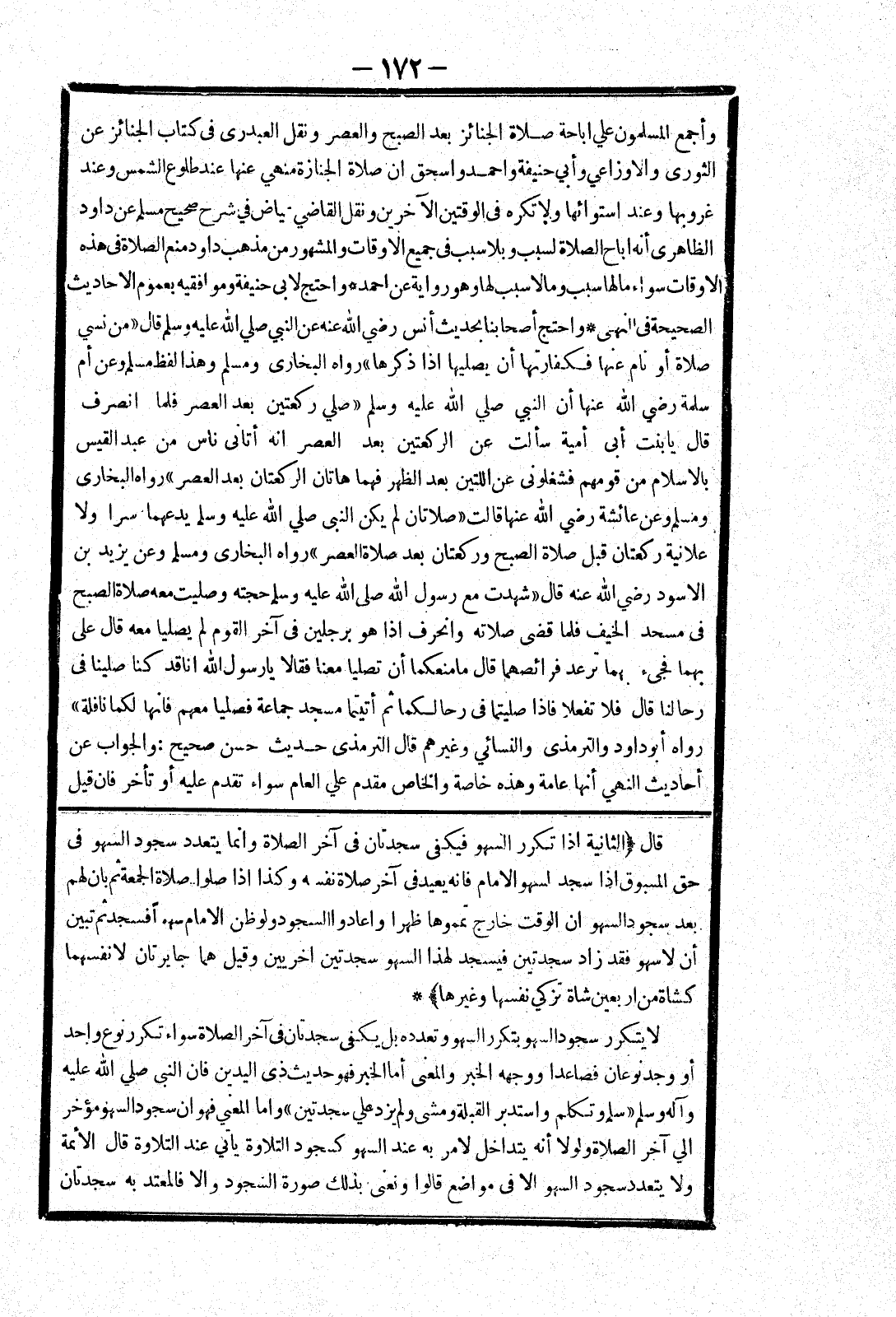 قال (الثانية إذا تكرر السهو فيكفى سجدتان في آخر الصلاة وانما يتعدد سجود السهو في حق المسبوق إذا سجد لسهو الامام فانه يعيد في آخر صلاة نفسه وكذا إذا صلوا صلاة الجمعة ثم بان لهم بعد سجود السهو ان الوقت خارج تمموها ظهرا واعادوا السجود ولو ظن الامام سهوا فسجد ثم تبين أن لا سهو فقد زاد سجدتين فيسجد لهذا السهو سجدتين اخريين وقيل هما جايرتان لانفسهما كشاة من اربعين شاة تزكي نفسها وغيرها) * لا يتكرر سجود السهو بتكرر السهو وتعدده بل يكفى سجدتان في آخر الصلاة سواء تكرر نوع واحد أو وجود نوعان فصاعدا ووجهه الخبر والمعنى أما الخبر فهو حديث ذى اليدين فان النبي صلي الله عليه وسلم " سلم وتكلم واستدبر القبلة ومشى ولم يزد على سجدتين " واما المعني فهو ان سجود السهو مؤخر الي آخر الصلاة ولولا أنه يتداخل لامر به عند السهو كسجود التلاوة ياتي عند التلاوة قال الائمة ولا يتعدد سجود السهو الا في مواضع قالوا ونعنى بذلك صورة السجود والا فالمعتد به سجدتان