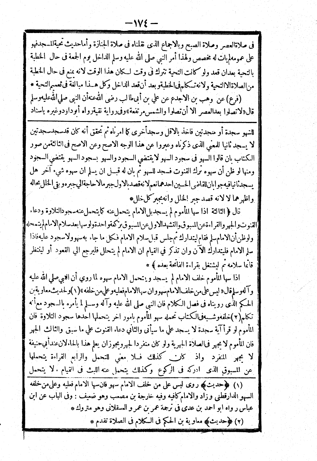 قائما سلامه ثم ليشتغل بقراءة الفاتحة بعده) * إذا سها المأموم خلف الامام لم يسجد ويتحمل الامام سهوه لما روي أن النبي صلي الله عليه وسلم قال " ليس على من خلف الامام سهو وان سها الامام فعليه وعلي من خلفه " ولحديث معاوية بن الحكم الذى رويناه في فصل الكلام فان النبي صلى الله عليه وسلم لم يأمره بالسجود مع أنه تكلم خلفه وشبه في الكتاب تحمله سهو المأموم بامور اخر يتحملها احدها سجود التلاوة فان المأموم لو قرأ آية سجدة لا يسجد علي ما سيأتي والثاني دعاء القنوت علي ما سبق والثالث الجهر فان المأموم لا يجهر في الصلاة الجهرية ولو كان منفردا لجهر ويجوز ان يعلم هذا بالحاء لان عند أبي حنيفة لا يجهر المنفرد وإذا كان كذلك فلا معني للتحمل والرابع القراءة يتحملها عن المسبوق الذى ادركه في الركوع وكذلك يتحمل عنه اللبث في القيام.