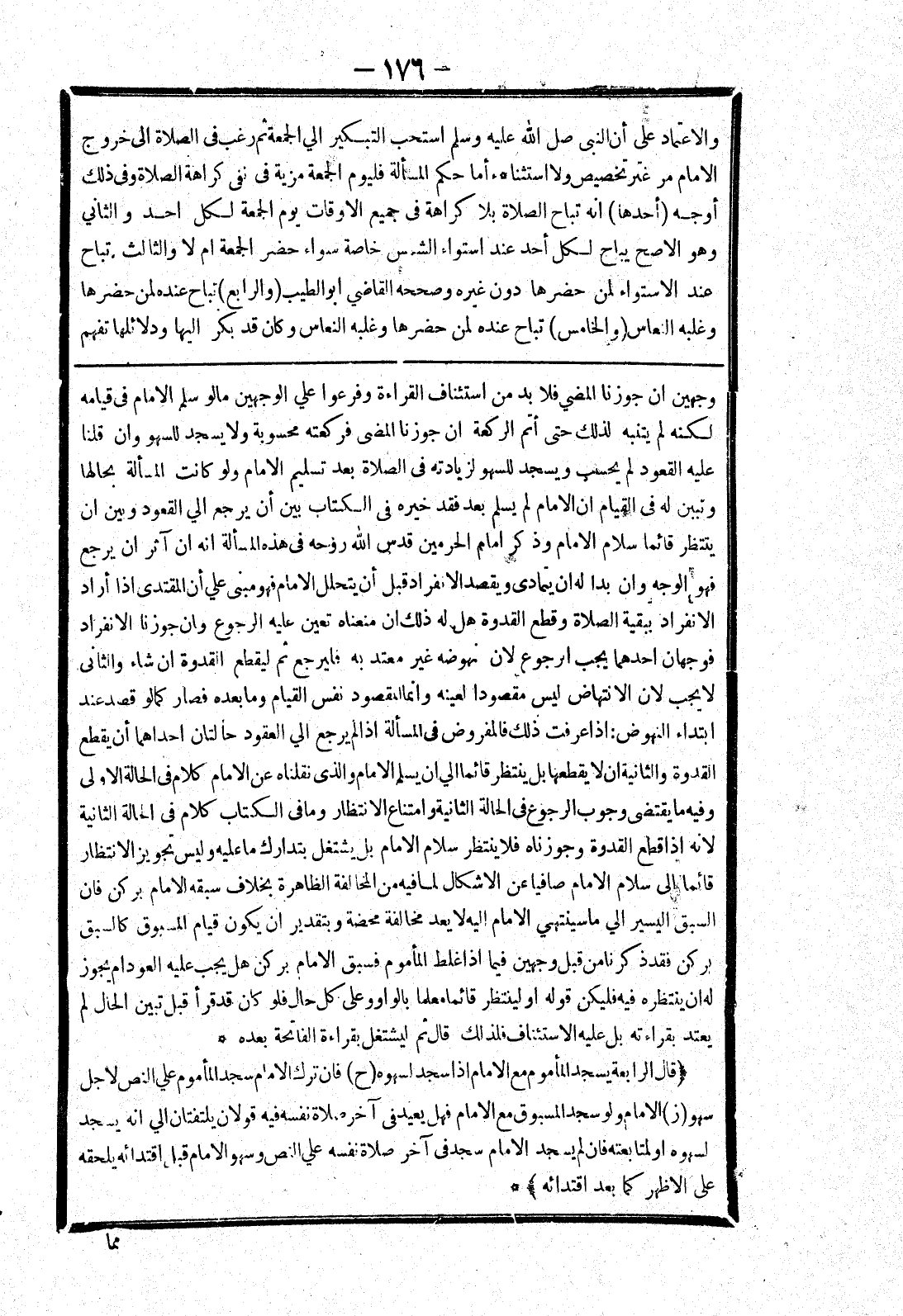 لانه إذا قطع القدوة وجوزناه فلا ينتظر سلام الامام بل يشتغل بتدارك ما عليه وليس تجويز الانتظار قائما إلى سلام الامام صافيا عن الاشكال لما فيه من المخالفة الظاهرة بخلاف سبقه الامام بركن فان السبق اليسير الي ما سينتهي الامام إليه لا يعد مخالفة محضة وبتقدير ان يكون قيام المسبوق كالسبق بركن فقد ذكرنا من قبل وجهين فيما إذا غلط المأموم فسبق الامام بركن هل يجب عليه العود ام يجوز له ان ينتظره فيه فليكن قوله أو لينتظر قائما معلما بالواو وعلى كل حال فلو كان قد قرأ قبل تبين الحال لم يعتد بقراءته بل عليه الاستئناف فلذلك قال ثم ليشتغل بقراءة الفاتحة بعده * (قال الرابعة يسجد المأموم مع الامام إذا سجد لسهوه (ح) فان ترك الامام سجد المأموم علي النص لاجل سهو (ز) الامام ولو سجد المسبوق مع الامام فهل يعيد في آخره صلاة نفسه فيه قولان يلتفتان الي انه يسجد لسهوه أو لمتابعته فان لم يسجد الامام سجد في آخر صلاة نفسه علي النص وسهو الامام قبل اقتدائه يلحقه على الاظهر كما بعد اقتدائه) *