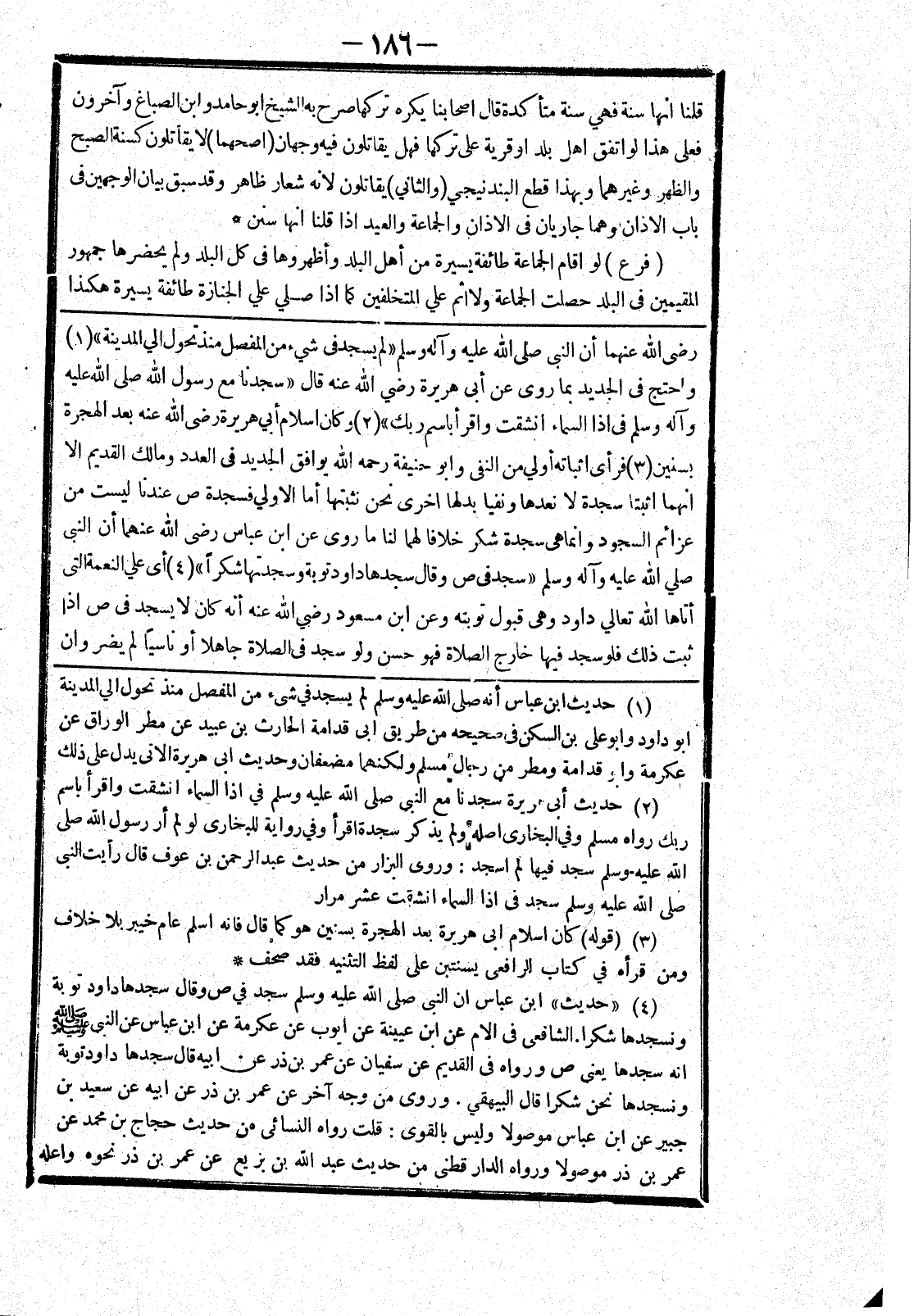 رضى الله عنهما أن النبي صلى الله عليه وسلم " لم يسجد في شئ من المفصل منذ تحول الي المدينة " واحتج في الجديد بما روى عن أبى هريرة رضي الله عنه قال " سجدنا مع رسول الله صلى الله عليه وسلم في إذا السماء انشقت واقرأ باسم ربك " وكان اسلام أبي هريرة رضى الله عنه بعد الهجرة بسنين فرأى اثباته أولي من النفى وابو حنيفة رحمه الله يوافق الجديد في العدد ومالك القديم الا انهما اثبتا سجدة لا نعدها ونفيا بدلها اخرى نحن نثبتها أما الاولي فسجدة ص عندنا ليست من عزائم السجود وانما هي سجدة شكر خلافا لهما لنا ما روى عن ابن عباس رضى الله عنهما أن النبي صلي الله عليه وسلم " سجد في ص وقال سجدها داود توبة وسجدتها شكرا " أي علي النعمة التى أتاها الله تعالي داود وهى قبول توبته وعن ابن مسعود رضي الله عنه أنه كان لا يسجد في ص إذا ثبت ذلك فلو سجد فيها خارج الصلاة فهو حسن ولو سجد في الصلاة جاهلا أو ناسيا لم يضر وان