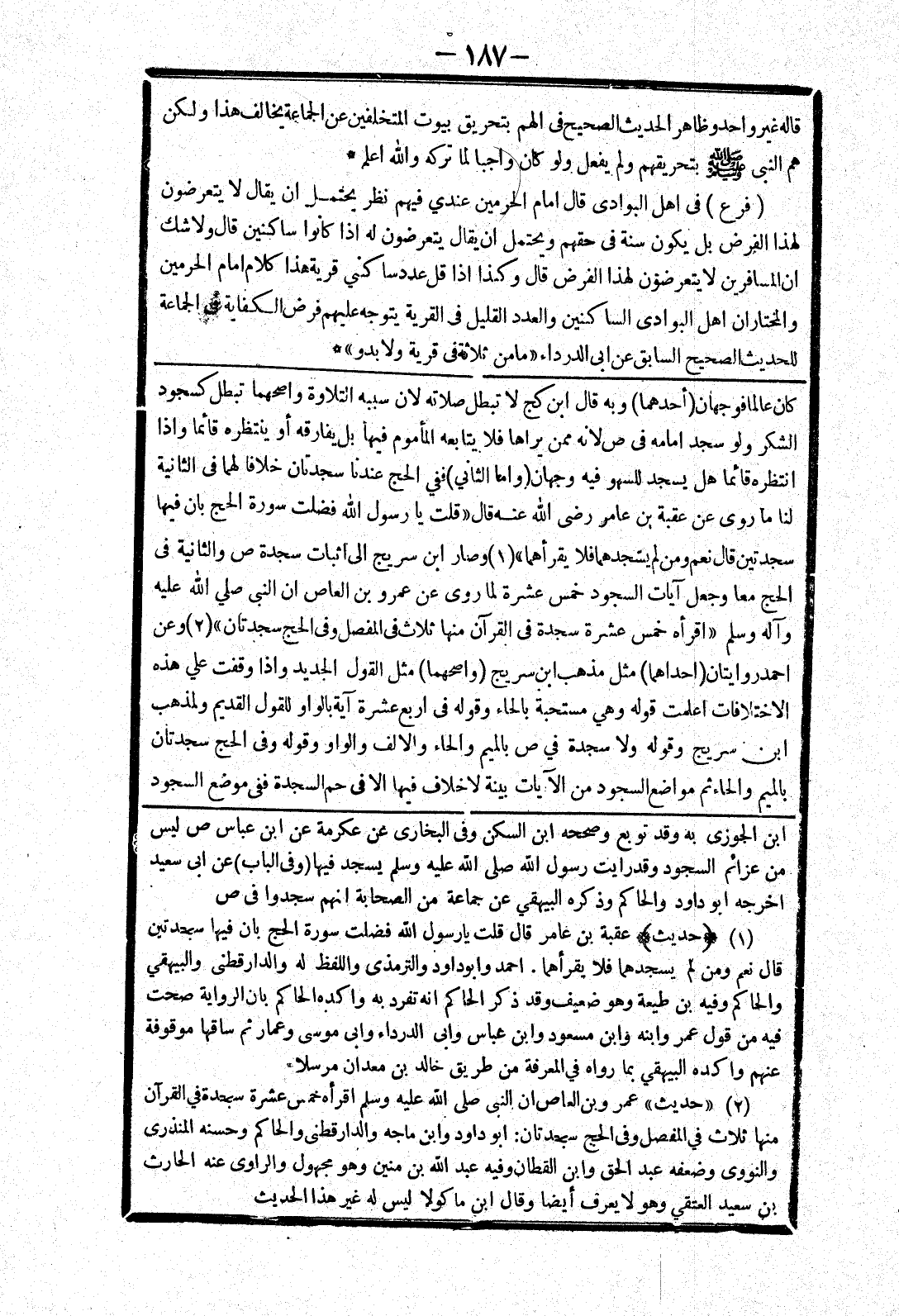كان عالما فوجهان (أحدهما) وبه قال ابن كج لا تبطل صلاته لان سببه التلاوة واصحهما تبطل كسجود الشكر ولو سجد امامه في ص لانه ممن يراها فلا يتابعه المأموم فيها بل يفارقه أو ينتظره قائما وإذا انتظره قائما هل يسجد للسهو فيه وجهان (واما الثاني) ففي الحج عندنا سجدتان خلافا لهما في الثانية لنا ما روى عن عقبة بن عامر رضى الله عنه قال " قلت يا رسول الله فضلت سورة الحج بان فيها سجدتين قال نعم ومن لم يسجدهما فلا يقرأهما " وصار ابن سريج إلى اثبات سجدة ص والثانية في الحج معا وجعل آيات السجود خمس عشرة لما روى عن عمرو بن العاص ان النبي صلي الله عليه وسلم " اقرأه خمس عشرة سجدة في القرآن منها ثلاث في المفصل وفى الحج سجدتان " وعن احمد روايتان (احداهما) مثل مذهب ابن سريج (واصحهما) مثل القول الجديد وإذا وقفت علي هذه الاختلافات اعلمت قوله وهي مستحبة بالحاء وقوله في اربع عشرة آية بالواو للقول القديم ولمذهب
