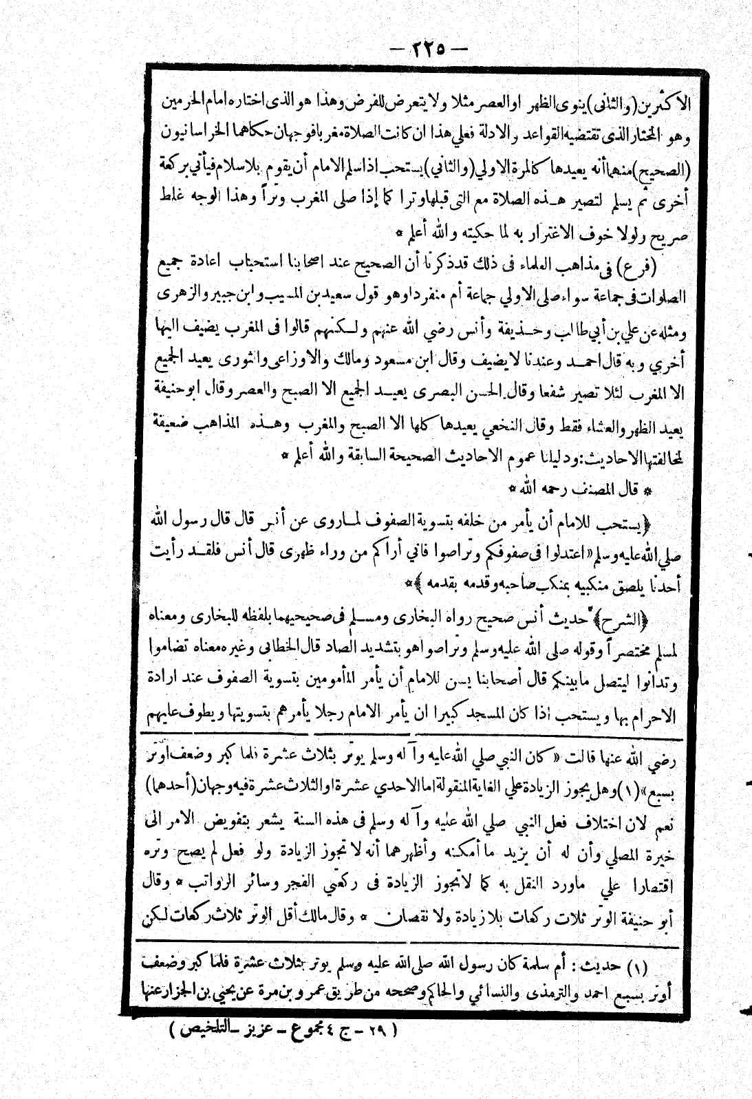 رضي الله عنها قالت " كان النبي صلى الله عليه وسلم يوتر بثلاث عشرة فلما كبر وضعف اوتر بسبع " وهل يجوز الزيادة علي الغاية المنقولة اما الاحدي عشرة أو الثلاث عشرة فيه وجهان (أحدهما) نعم لان اختلاف فعل النبي صلي الله عليه وسلم في هذه السنة يشعر بتفويض الامر إلى خيرة المصلي وأن له أن يزيد ما أمكنه وأظهرهما أنه لا تجوز الزيادة ولو فعل لم يصح وتره اقتصارا علي ما ورد النقل به كما لا تجوز الزيادة في ركعتي الفجر وسائر الرواتب * وقال أبو حنيفة الوتر ثلاث ركعات بلا زيادة ولا نقصان * وقال مالك أقل الوتر ثلاث ركعات لكن