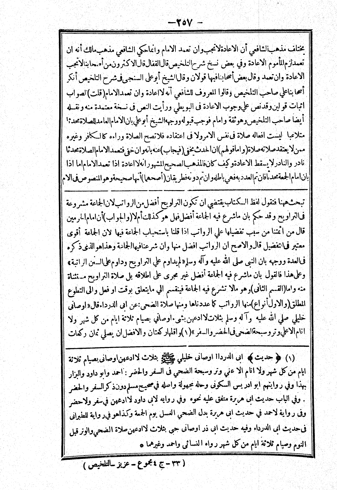 تبحث ههنا فتقول لفظ الكتاب يقتضي ان تكون التراويح أفضل من الرواتب لان الجماعة مشروعة في التراويح وقد حكم بان ما شرع فيه الجماعة أفضل فهل هو كذلك أم لا (والجواب) أن امام الحرمين قال من أئمتنا من سبب تفضيلها علي الرواتب إذا قلنا باستحباب الجماعة فيها لان الجماعة أقوى معتبر في التفضيل قال والاصح ان الرواتب افضل منها وان شرعنا فيها الجماعة وهذا هو الذى ذكره في العدة ووجهه بان النبي صلى الله عليه وسلم " لم يداوم علي التراويح وداوم على السنن الراتبة " وعلى هذا فالقول بان ما شرع فيه الجماعة أفضل غير مجرى على اطلاقه بل صلاة التراويح مستثناة منه واما (القسم الثاني) وهو مالا تشرع فيه الجماعة فينقسم الي ما يتعلق بوقت أو فعل والى التطوع المطلق (والاول أنواع) منها الرواتب كما عددناها ومنها صلاة الضحى: عن ابى الدرداء قال " اوصاني خليلي صلي الله عليه وسلم بثلاث لا ادعهن بشئ اوصاني بصيام ثلاثة ايام من كل شهر ولا انام الا علي وتر وسبحة الضحى في الحضر والسفر " واقلها ركعتان والافضل ان يصلي ثمان ركعات