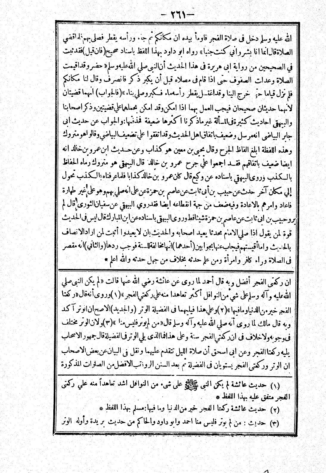 ان ركعتي الفجر أفضل وبه قال أحمد لما روى عن عائشة رضي الله عنها قالت " لم يكن النبي صلي الله عليه وسلم على شئ من النوافل أكثر تعاهدا منه علي ركعتي الفجر " وروى أنه قال " ركعتا الفجر خير من الدنيا وما فيها " وعلي هذا فيليهما في الفضيلة الوتر (والجديد) الاصح ان الوتر آكد وبه قال مالك لما روى أنه صلي الله عليه وسلم قال " من لم يوتر فليس منا " ولان الوتر مختلف في وجوبه ولا خلاف في ان ركعتي الفجر سنة وعلى هذا فما الذى يلي الوتر في الفضيلة قال جمهور الاصحاب يليه ركعتا الفجر وعن ابى اسحق أن صلاة الليل تتقدم عليهما ونقل في البيان عن بعض الاصحاب ان الوتر وركعتي الفجر يستويان في الفضيلة ثم بعد السنن الرواتب الافضل من الصلوات المذكورة