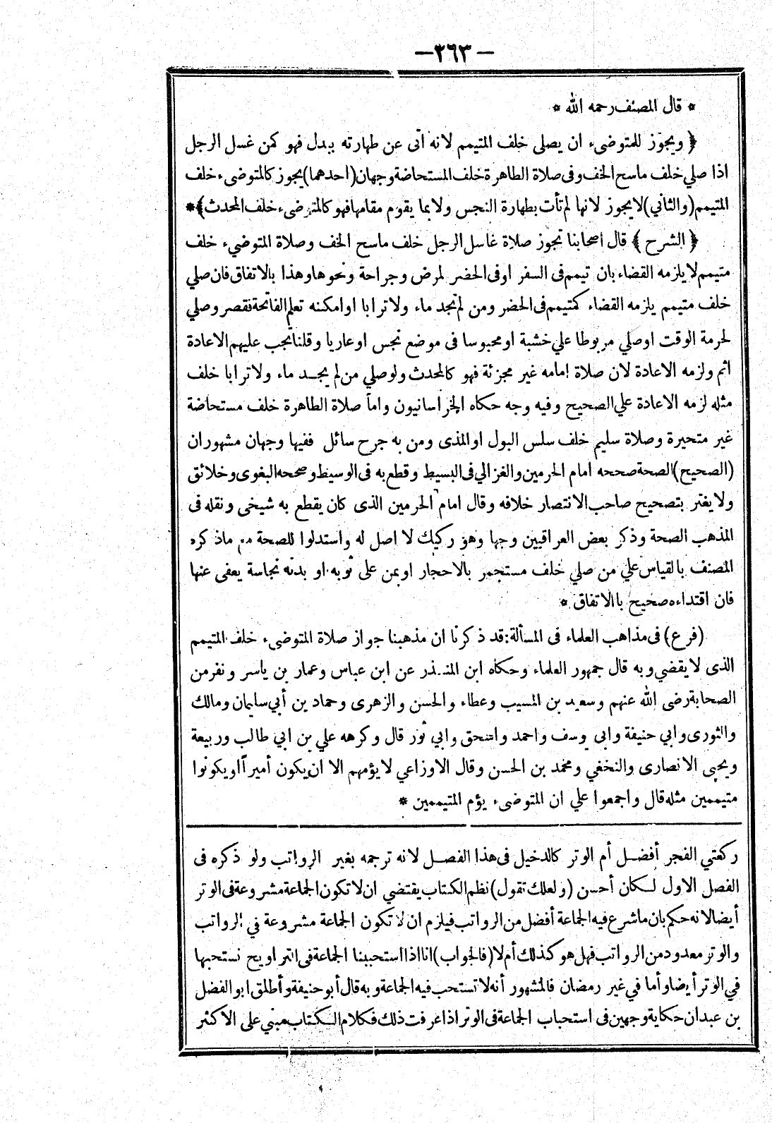 ركعتي الفجر أفضل أم الوتر كالدخيل في هذا الفصل لانه ترجمه بغير الرواتب ولو ذكره في الفصل الاول لكان أحسن (ولعلك تقول) نظم الكتاب يقتضي ان لا تكون الجماعة مشروعة في الوتر أيضا لانه حكم بان ما شرع فيه الجماعة أفضل من الرواتب فيلزم ان لا تكون الجماعة مشروعة في الرواتب والوتر معدود من الرواتب فهل هو كذلك أم لا (فالجواب) انا إذا استحببنا الجماعة في التراويح نستحبها