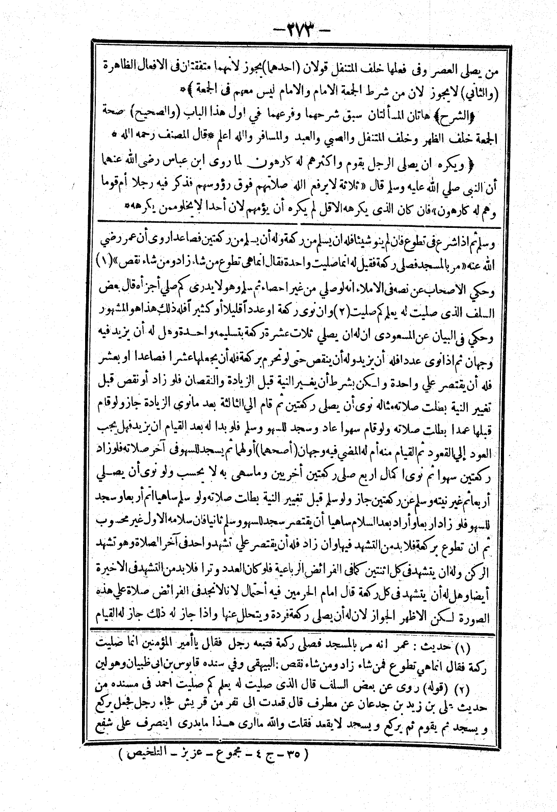 السلف الذى صليت له يعلم كم صليت وان نوى ركعة أو عددا قليلا أو كثيرا فله ذلك هذا هو المشهور وحكي في البيان عن المسعودي ان له ان يصلي ثلاث عشرة ركعة بتسليمه واحدة وهل له أن يزيد فيه وجهان ثم إذا نوى عددا فله أن يزيد وله أن ينقص حتى لو تحرم بركعة فله أن يجعلها عشرا فصاعدا أو بعشر فله أن يقتصر علي واحدة ولكن بشرط أن يغير النية قبل الزيادة والنقصان فلو زاد أو نقص قبل تغيير النية بطلت صلاته مثاله نوى أن يصلى ركعتين ثم قام الي الثالثة بعد ما نوى الزيادة جاز ولو قام قبلها عمدا بطلت صلاته ولو قام سهوا عاد وسجد للسهو وسلم فلو بدا له بعد القيام ان يزيد فهل يجب العود إلي القعود ثم القيام منه أم له المضي فيه وجهان (أصحهما) أولهما ثم يسجد للسهو في آخر صلاته فلو زاد ركعتين سهوا ثم نوى اكمال اربع صلى ركعتين أخريين وما سهى به لا يحسب ولو نوى أن يصلي أربعا غير نيته وسلم عن ركعتين جاز ولو سلم قبل تغيير النية بطلت صلاته ولو سلم ساهيا أتم أربعا وسجد للسهو فلو زاد اربعا وأراد بعد السلام ساهيا أن يقتصر سجد للسهو وسلم ثانيا فان سلامه الاول غير محسوب ثم ان تطوع بركعة فلا بد من التشهد فيها وان زاد فله أن يقتصر علي تشهد واحد في آخر الصلاة وهو تشهد الركن وله ان يتشهد في كل اثنتين كما في الفرائض الرباعية فلو كان العدد وترا فلا بد من التشهد في الاخيرة أيضا وهل له أن يتشهد في كل ركعة قال امام الحرمين فيه أحتمال لانا لا نجد في الفرائض صلاة علي هذه الصورة لكن الاظهر الجواز لان له أن يصلى ركعة فردة ويتحلل عنها وإذا جاز له ذلك جاز له القيام