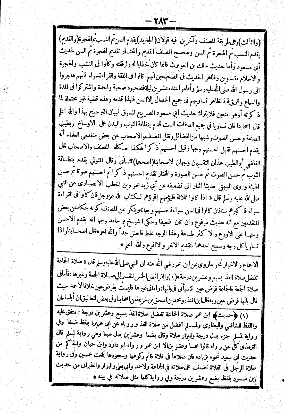 الاجماع والاخبار نحو ما روى عن ابن عمر رضي الله عنه ان النبي صلى الله عليه وسلم قال " صلاة الجماعة تفضل صلاة الفذ بسبع وعشرين درجة " والفرائض الخمس تنقسم إلي صلاة الجمعة وغيرها: فأما في صلاة الجمعة فالجماعة فرض عين كما سيأتي في بابها: واما في غيرها فليست بفرض عين خلافا لاحمد حيث قال بانها فرض عين وبه قال ابن المنذر ومحمد بن اسحق بن خزيمة من اصحابنا وفى بعض التعاليق ان أبا سليمان