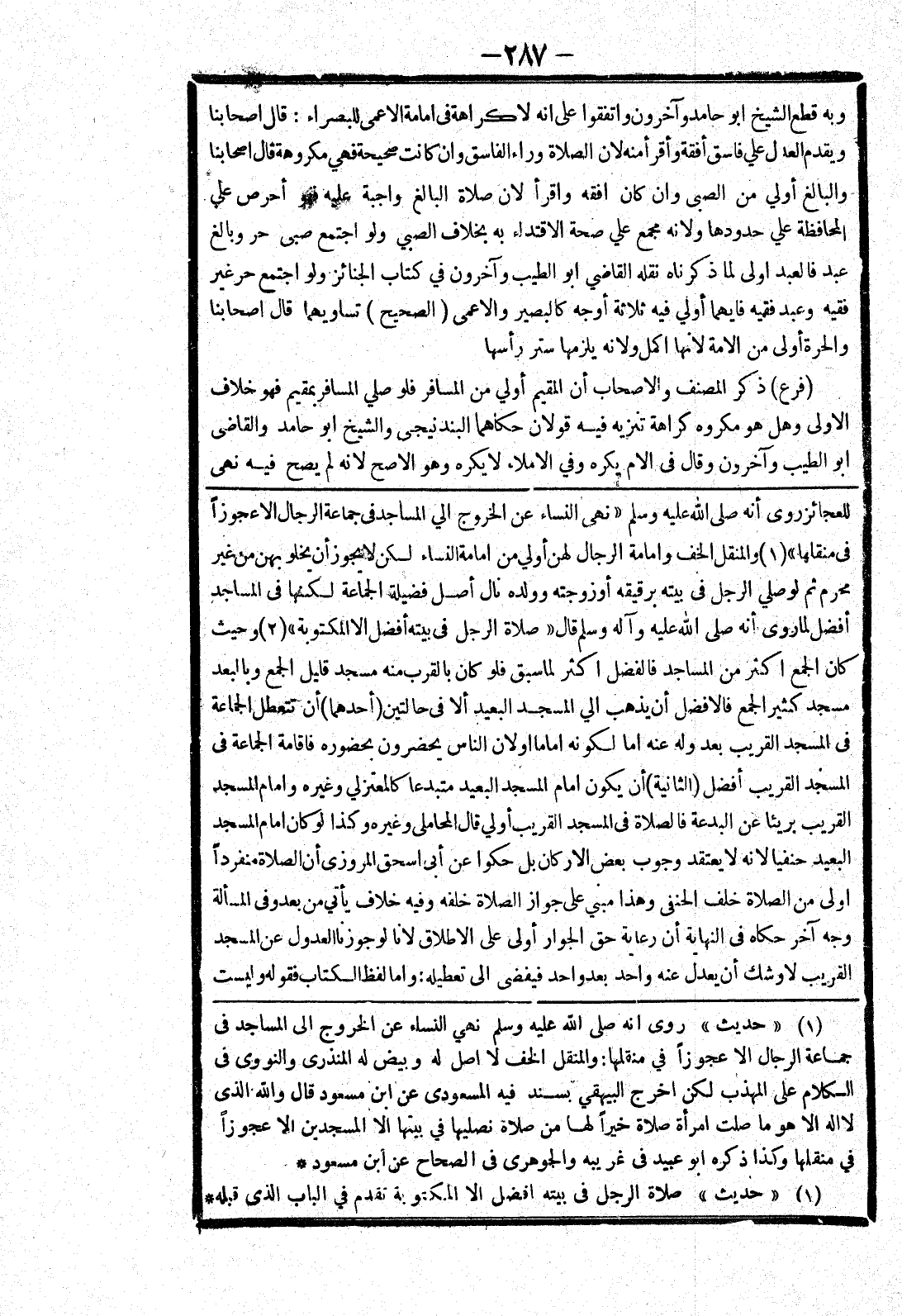 للعجائز روى أنه صلى الله عليه وسلم " نهى النساء عن الخروج الي المساجد في جماعة الرجال الا عجوزا في منقلها " والمنقل الخف وامامة الرجال لهن أولي من امامة النساء لكن لا يجوز أن يخلو بهن من غير محرم ثم لو صلي الرجل في بيته برقيقه أو زوجته وولده نال أصل فضيلة الجماعة لكنها في المساجد أفضل لما روى أنه صلى الله عليه وسلم قال " صلاة الرجل في بيته أفضل الا المكتوبة " وحيث كان الجمع اكثر من المساجد فالفضل اكثر لما سبق فلو كان بالقرب منه مسجد قليل الجمع وبالبعد مسجد كثير الجمع فالافضل أن يذهب الي المسجد البعيد ألا في حالتين (أحدهما) أن تتعطل الجماعة في المسجد القريب بعد وله عنه اما لكونه اماما أو لان الناس يحضرون بحضوره فاقامة الجماعة في المسجد القريب أفضل (الثانية) أن يكون امام المسجد البعيد متبدعا كالمعتزلي وغيره وامام المسجد القريب بريئا عن البدعة فالصلاة في المسجد القريب أولي قال المحاملى وغيره وكذا لو كان امام المسجد البعيد حنفيا لانه لا يعتقد وجوب بعض الاركان بل حكوا عن أبى اسحق المروزى أن الصلاة منفردا اولى من الصلاة خلف الحنفي وهذا مبني على جواز الصلاة خلفه وفيه خلاف يأتي من بعد وفى المسألة وجه آخر حكاه في النهاية أن رعاية حق الجوار أولى على الاطلاق لانا لو جوزنا العدول عن المسجد القريب لاوشك أن يعدل عنه واحد بعد واحد فيفضى إلى تعطيله: واما لفظ الكتاب فقوله وليست