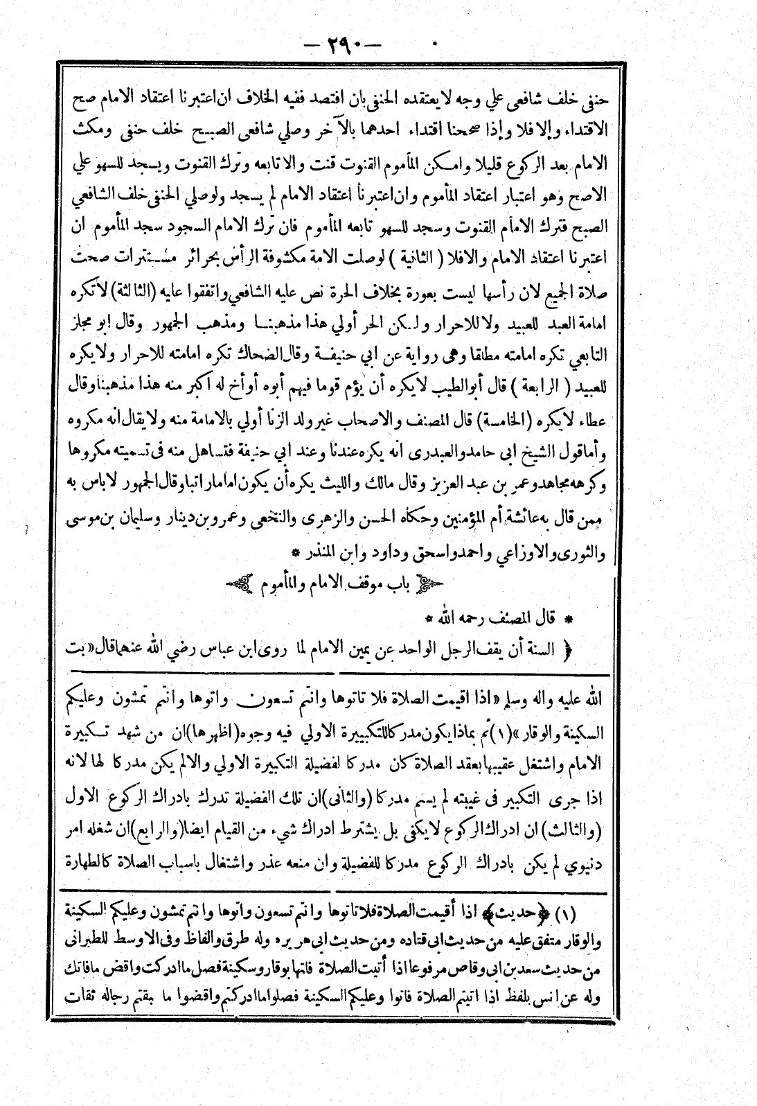 الله عليه واله وسلم " إذا اقيمت الصلاة فلا تأتوها وانتم تسعون واتوها وانتم تمشون وعليكم السكينة والوقار " ثم بماذا يكون مدركا للتكبيرة الاولي فيه وجوه (اظهرها) ان من شهد تكبيرة الامام واشتغل عقيبها بعقد الصلاة كان مدركا لفضيلة التكبيرة الاولي والا لم يكن مدركا لها لانه إذا جرى التكبير في غيبته لم يسم مدركا (والثانى) ان تلك الفضيلة تدرك بادراك الركوع الاول (والثالث) ان ادراك الركوع لا يكفى بل يشترط ادراك شئ من القيام ايضا (والرابع) ان شغله امر دنيوي لم يكن بادراك الركوع مدركا للفضيلة وان منعه عذر واشتغال باسباب الصلاة كالطهارة