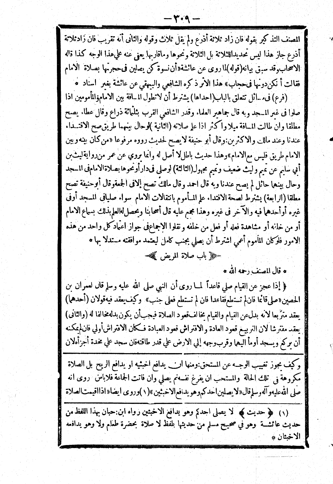 وكيف يجوز تغييب الوجه عن المستحق: ومنها ان يدافع اخبثيه أو يدافع الريح بل الصلاة مكروهة في تلك الحالة والمستحب ان يفرغ نفسه ثم يصلي وان فاتت الجماعة فلا باس روى انه صلى الله عليه وسلم قال " لا يصلين احدكم وهو يدافع الاخبثين " وروى ايضا " إذا اقيمت الصلاة
