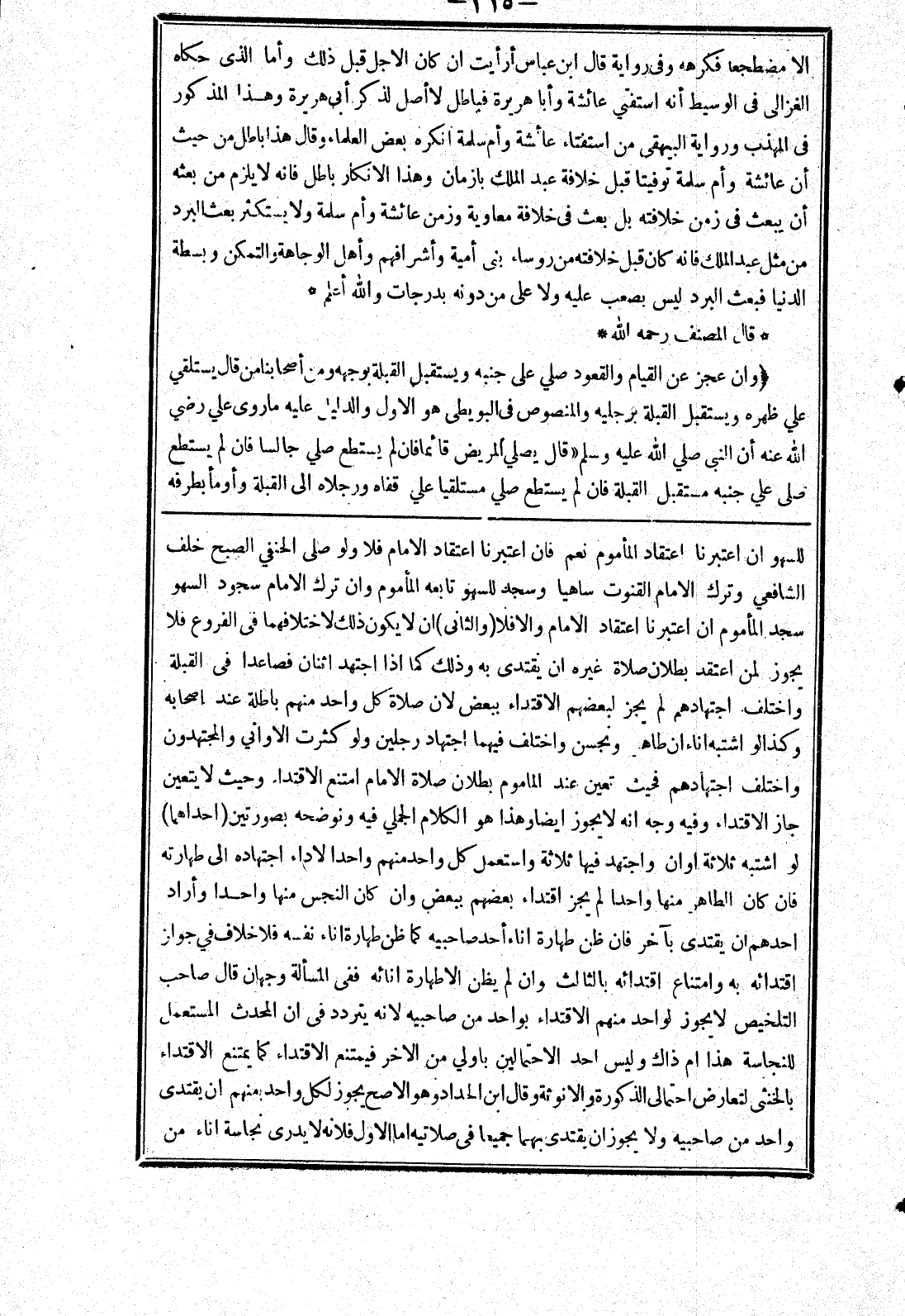 الشافعي وترك الامام القنوت ساهيا وسجد للسهو تابعه المأموم وان ترك الامام سجود السهو سجد المأموم ان اعتبرنا اعتقاد الامام والا فلا (والثانى) ان لا يكون ذلك لاختلافهما في الفروع فلا يجوز لمن اعتقد بطلان صلاة غيره ان يقتدى به وذلك كما إذا اجتهد اثنان فصاعدا في القبلة واختلف اجتهادهم لم يجز لبعضهم الاقتداء ببعض لان صلاة كل واحد منهم باطلة عند اصحابه وكذا لو اشتبه اناءان طاهر ونجسن واختلف فيهما اجتهاد رجلين ولو كثرت الاواني والمجتهدون واختلف اجتهادهم فحيث تعين عند المأموم بطلان صلاة الامام امتنع الاقتدا وحيث لا يتعين جاز الاقتداء وفيه وجه انه لا يجوز ايضا وهذا هو الكلام الجملي فيه ونوضحه بصورتين (احداهما) لو اشتبه ثلاثة اوان واجتهد فيها ثلاثة واستعمل كل واحدا منهم واحدا لاداء اجتهاده إلى طهارته فان كان الطاهر منها واحدا لم يجز اقتداء بعضهم ببعض وان كان النجس منها واحد وأراد احدهم ان يقتدى بآخر فان ظن طهارة اناء أحد صاحبيه كما ظن طهارة اناء نفسه فلا خلاف في جواز اقتدائه به وامتناع اقتدائه بالثالث وان لم يظن الا طهارة انائه ففى المسألة وجهان قال صاحب التلخيص لا يجوز لواحد منهم الاقتداء بواحد من صاحبيه لانه يتردد في ان المحدث المستعمل للنجاسة هذا ام ذاك وليس احد الاحتمالين باولي من الاخر فيمتنع الاقتداء كما يمتنع الاقتداء بالخنثى لتعارض احتمالي الذكورة والانوثة وقال ابن الحداد وهو الاصح يجوز لكل واحد منهم ان يقتدى بواحد من صاحبيه ولا يجوز ان يقتدى بهما جميعا في صلاتيه اما الاول فلانه لا يدرى نجاسة اناء من