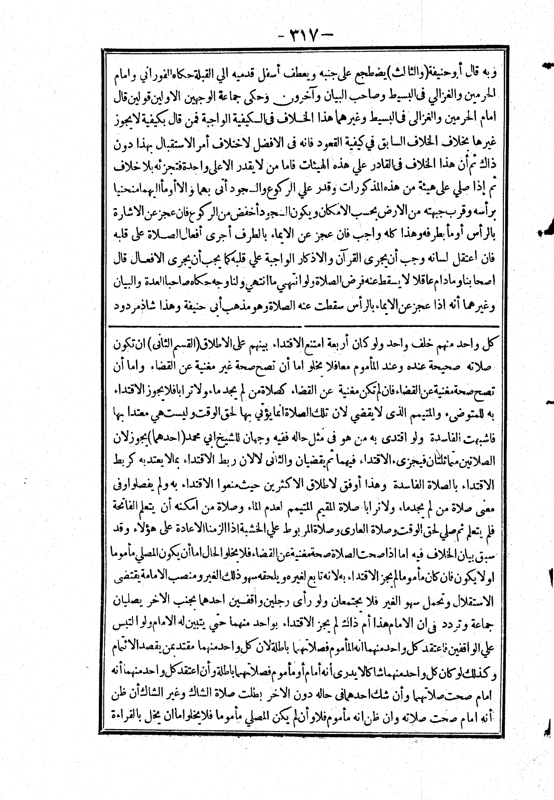 كل واحد منهم خلف واحد ولو كان أربعة امتنع الاقتداء بينهم على الاطلاق (القسم الثاني) ان تكون صلاته صحيحة عنده وعند المأموم معا فلا يخلو اما أن تصح صحة غير مغنية عن القضاء واما أن تصح صحة مغنية عن القضاء فان لم تكن مغنية عن القضاء كصلاة من لم يجد ماء ولا ترابا فلا يجوز الاقتداء به للمتوضئ وللمتيمم الذى لا يقضي لان تلك الصلاة انما يؤتي بها لحق الوقت وليست هي معتدا بها فاشبهت الفاسدة ولو اقتدى به من هو في مثل حاله ففيه وجهان للشيخ ابي محمد (احدهما) يجوز لان الصلاتين متماثلتان فيجزئ الاقتداء فيهما ثم يقضيان والثانى لا لان ربط الاقتداء بمالا يعتد به كربط الاقتداء بالصلاة الفاسدة وهذا أوفق لاطلاق الاكثرين حيث منعوا الاقتداء به ولم يفصلوا وفى معنى صلاة من لم يجد ماء ولا ترابا صلاة المقيم المتيمم لعدم الماء وصلاة من امكنه أن يتعلم الفاتحة فلم يتعلم ثم صلي لحق الوقت وصلاة العارى وصلاة المربوط علي الخشبة إذا الزمنا الاعادة على هؤلاء وقد