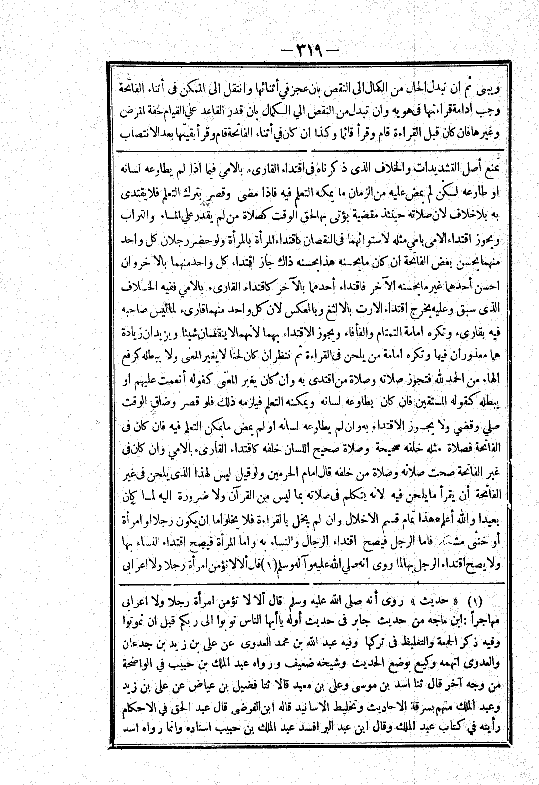 تمنع أصل التشديدات والخلاف الذى ذكرناه في اقتداء القارئ بالامي فيما إذا لم يطاوعه لسانه أو طاوعه لكن لم يمض عليه من الزمان ما يمكنه التعلم فيه فإذا مضى وقصر بترك التعلم فلا يقتدى به بلا خلاف لان صلاته حينئذ مقضية يؤتى بها لحق الوقت كصلاة من لم يقدر علي الماء والتراب ويجوز اقتداء الامي بامي مثله لاستوائهما في النقصان كاقتداء المرأة بالمرأة ولو حضر رجلان كل واحد منهما يحسن بعض الفاتحة ان كان ما يحسنه هذا يحسنه ذاك جاز اقتداء كل واحد منهما بالاخر وان احسن أحدهما غير ما يحسنه الآخر فاقتداء أحدهما بالآخر كاقتداء القارئ بالامي ففيه الخلاف الذى سبق وعليه يخرج اقتداء الارت بالالثغ وبالعكس لان كل واحد منهما قارئ لما ليس صاحبه فيه بقارئ وتكره امامة التمتام والفأفاء ويجوز الاقتداء بهما لانهما لا ينقصان شيئا ويزيدان زيادة هما معذوران فيها وتكره امامة من يلحن في القراءة ثم ننظر ان كان لحنا لا يغير المعنى ولا يبطله كرفع الهاء من الحمد لله فتجوز صلاته وصلاة من اقتدى به وان كان يغير المعنى كقوله أنعمت عليهم أو يبطله كقوله المستقين فان كان يطاوعه لسانه ويمكنه التعلم فيلزمه ذلك فلو قصر وضاق الوقت صلي وقضي ولا يجوز الاقتداء به وان لم يطاوعه لسانه أو لم يمض ما يمكن التعلم فيه فان كان في الفاتحة فصلاة مثله خلفه صحيحة وصلاة صحيح اللسان خلفه كاقتداء القارئ بالامي وان كان في غير الفاتحة صحت صلاته وصلاة من خلفه قال امام الحرمين ولو قيل ليس لهذا الذى يلحن في غير الفاتحة أن يقرأ ما يلحن فيه لانه يتكلم في صلاته بما ليس من القرآن ولا ضرورة إليه لما كان بعيدا والله أعلم * هذا تمام قسم الاخلال وان لم يخل بالقراءة فلا يخلو اما ان يكون رجلا أو امرأة أو خنثى مشكل فاما الرجل فيصح اقتداء الرجال والنساء به واما المرأة فيصح اقتداء النساء بها