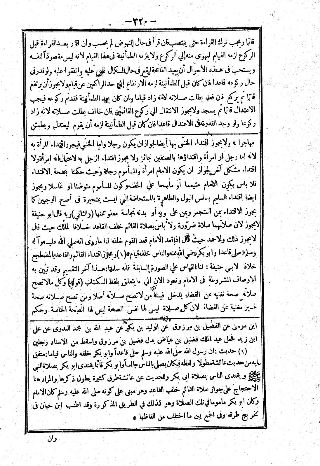 مهاجرا " ولا يجوز اقتداء الخنثى بها أيضا لجواز ان يكون رجلا واما الخنثي فيجوز اقتداء المرأة به لانه اما رجل أو امرأة واقتداؤها بالصنفين جائز ولا يجوز اقتداء الرجل به لاحتمال انه امرأة ولا اقتداء مشكل آخر لجواز ان يكون الامام امرأة والمأموم رجلا وحيث حكمنا بصحة الاقتداء فلا باس بكون الامام متيمما أو ماسحا علي الخف وكون المأموم متوضئا أو غاسلا ويجوز ايضا اقتداء السليم بسلس البول والطاهرة بالمستحاضة التي ايست بمتحيرة في أصح الوجهين كما يجوز الاقتداء بمن استجمر وبمن على وبه أو بدنه نجاسة معفو عنها (والثاني) وبه قال أبو حنيفة لا يجوز لان صلاتهما صلاة ضرورة ولا باس بصلاة القائم خلف القاعد خلافا لمالك حيث قال لا يجوز ذلك ولاحمد حيث قال إذا قعد الامام قعد القوم خلفه لنا ما روى انه صلي الله عليه وسلم وسلم " صلى قاعدا وابو بكر رضي الله عنه والناس خلفه قيام " ويجوز اقتداء القائم والقاعد بالمضطجع خلافا لابي حنيفة: لنا القياس علي الصورة السابقة فانه سلمها: هذا آخر التقسيم وقد تبين به الاوصاف المشروطة في الامام ونعود الان الي ما يتعلق بلفظ الكتاب (قوله) وكل مالا تصح صلاته صحة تغنيه عن القضاء يدخل فيه من لا تصح صلاته أصلا ومن تصح صلاته صحة غير مغنية عن القضاء لان كل صلاة ليس لها الصحة ليس لها الصحة الخاصة وحكم