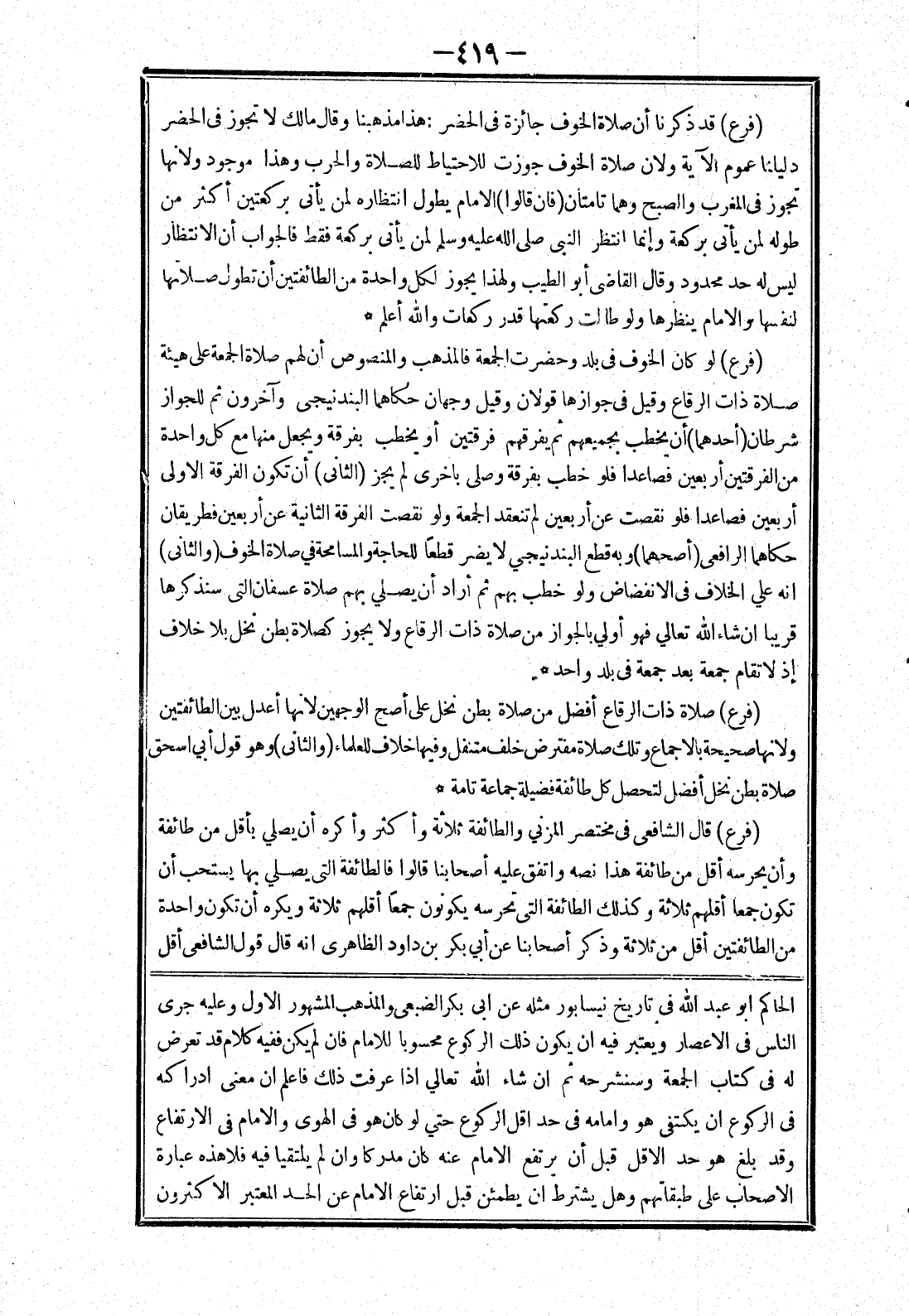 الحاكم أبو عبد الله في تاريخ نيسابور مثله عن ابى بكر الضبعى والمذهب المشهور الاول وعليه جرى الناس في الاعصار ويعتبر فيه ان يكون ذلك الركوع محسوبا للامام فان لم يكن ففيه كلام قد تعرض له في كتاب الجمعة وسنشرحه ثم ان شاء الله تعالي إذا عرفت ذلك فاعلم ان معنى ادراكه في الركوع ان يكتفى هو وامامه في حد اقل الركوع حتي لو كان هو في الهوى والامام في الارتفاع وقد بلغ هو حد الاقل قبل أن يرتفع الامام عنه كان مدركا وان لم يلتقيا فيه فلا هذه عبارة الاصحاب على طبقاتهم وهل يشترط ان يطمئن قبل ارتفاع الامام عن الحد المعتبر الاكثرون