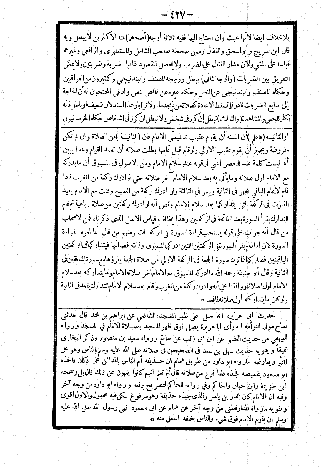 أو الثانية (فاعلم) أن السنة أن يقوم عقيب تسليمتى الامام فان (الثانية) من الصلاة وان لم تكن مفروضة ويجوز أن يقوم عقيب الاولي ولو قام قبل تمامها بطلت صلاته أن تعمد القيام وهذا يبين أنه ليست كلمة عند للحصر اعني في قوله عند سلام الامام ومن الاصول في المسبوق أن ما يدركه مع الامام اول صلاته وما يأتي به بعد سلام الامام آخر صلاته حتي لو ادرك ركعة من المغرب فإذا قام لاتمام الباقي يجهر في الثانية ويسر في الثالثة ولو ادرك ركعة من الصبح وقنت مع الامام يعيد القنوت في الركعة التى يتداركها بعد سلام الامام ونص أنه لو ادرك ركعتين من صلاة رباعية ثم قام للتدارك يقرأ السورة بعد الفاتحة في الركعتين وهذا يخالف قياس الاصل الذى ذكرناه فمن الاصحاب من قاله أنه جواب على قوله يستحب قراءة السورة في الركعات ومنهم من قال انما امره بقراءة السورة لان امامه لم يقرأ السورة في الركعتين اللتين ادركهما المسبوق وفاتته فضيلتها فيتداركها في الركعتين الباقيتين فصار كما إذا ترك سورة الجمعة في الركعة الاولي من صلاة الجمعة يقرؤها مع سورة المنافقين في الثانية وقال أبو حنيفة رحمه الله ما ادركه المسبوق مع الامام آخر صلاته الامام وما يتداركه بعد سلام الامام اول اصلاته ووافقنا علي أنه لو ادرك ركعة من المغرب وقام بعد سلام الامام للتدارك يقعد في الثانية ولو كان ما يتداركه أول صلاته لما قعد *