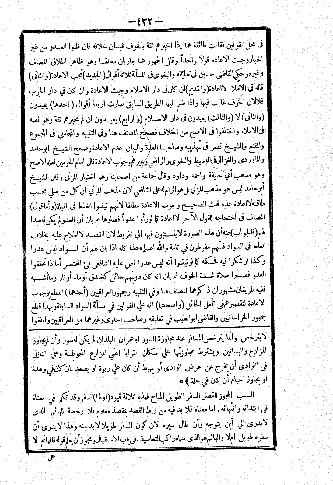 لا يترخص وانما يترخص المسافر عن مجاوزة السور أو عمران البلدان لم يكن له سور وأن لم يجاوز المزارع والبساتين ويشترط مجاوزتها علي سكان القرايا اعني المزارع المحوطة وعلي النازل في الوادي أن يخرج عن عرض الوادي أو يهبط أن كان علي ربوة أو يصعد ان كان في وهدة أو يجاوز الخيام أن كان في حلة) * السبب المجوز للقصر السفر الطويل المباح فهذه ثلاثة قيود (اولها) السفر وقد تكلم في معناة في ابتدائه وانتهائه.