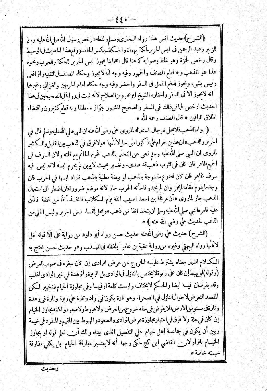 الكلام اضمار معناه يشترط عليه الخروج عن عرض الوادي إن كان سفره في صوب العرض (وقوله) أو يهبط إن كان على ربوة لا يختص بالنازل في الوادي بل الربوة والوهدة في غير الوادي اغلب وقد يفرضان فيه ايضا والحكم لا يختلف وليست كلمة أو فيهما وفى مجاوزة الخيام للتخيير لكن المقصد التعرض لاحوال النازل في الصحراء وهو تارة يكون في واد وتارة علي ربوة وتارة في وهدة وتارة في مستو من الارض فلا يفرض في حقه خروج من العرض ولا هبوط ولا صعود ولكنه يجاوز الخيام إن كان في حلة ولا فرق في اعتبار مجاوزة عرض الوادي والصعود والهبوط بين المقيم والمنفرد في خيمة