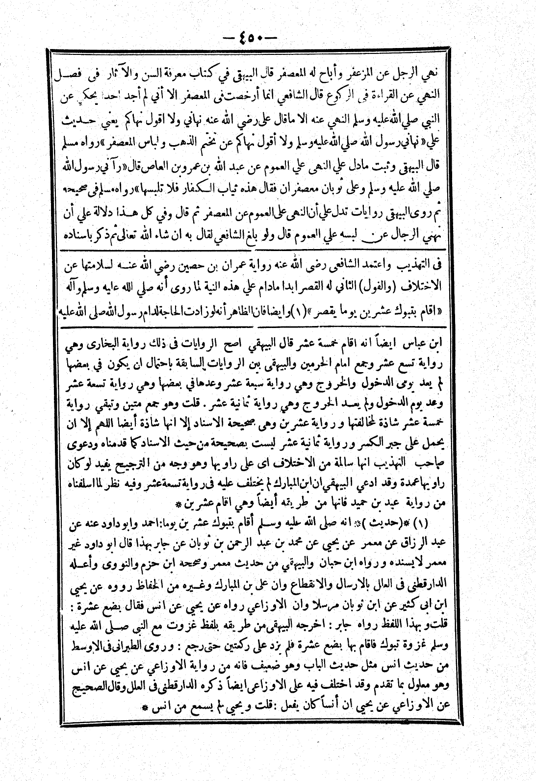 في التهذيب واعتمد الشافعي رضى الله عنه رواية عمران بن حصين رضي الله عنه لسلامتها عن الاختلاف (والقول) الثاني له القصر ابدا مادام علي هذه النية لما روى أنه صلي الله عليه وسلم وآله " اقام بتبوك عشرين يوما يقصر " وايضا فان الظاهر أنه لو زادت الحاجة لدام رسول الله صلى الله عليه