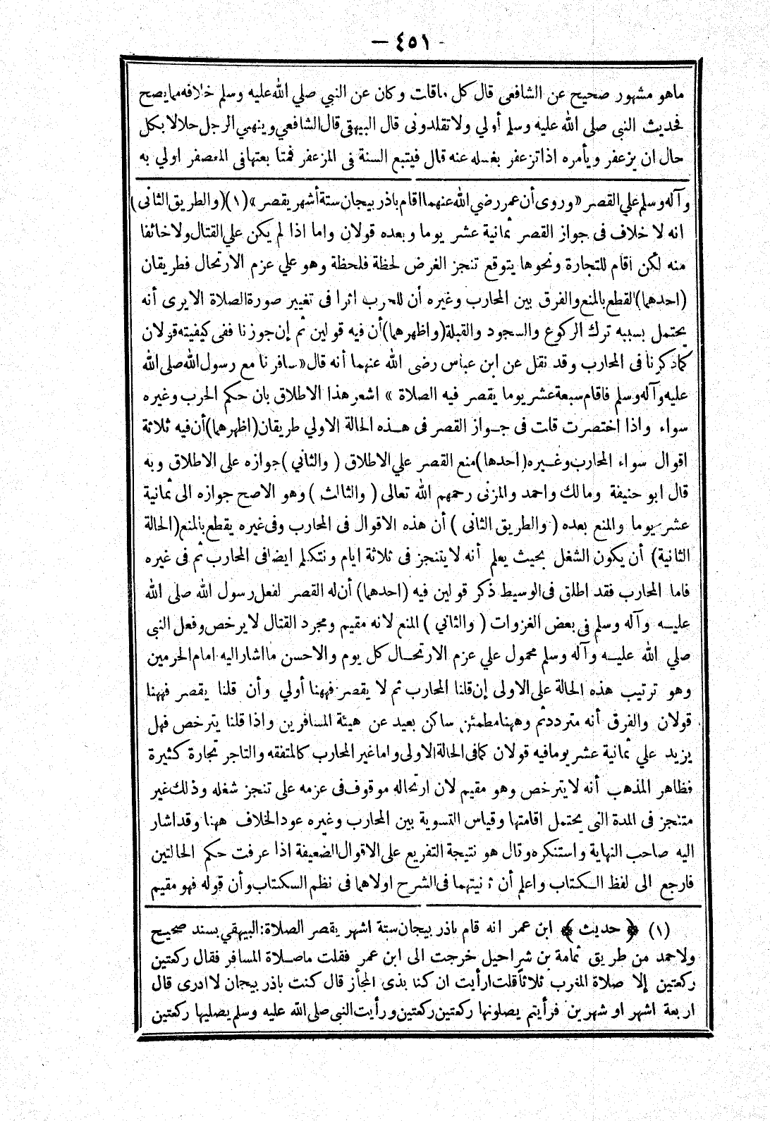 وسلم علي القصر " وروى أن عمر رضي الله عنهما اقام باذربيجان ستة أشهر يقصر " (والطريق الثاني) انه لا خلاف في جواز القصر ثمانية عشر يوما وبعده قولان واما إذا لم يكن علي القتال ولا خائفا منه لكن اقام للتجارة ونحوها يتوقع تنجز الغرض لحظة فلحظة وهو علي عزم الارتحال فطريقان (احدهما) القطع بالمنع والفرق بين المحارب وغيره أن للحرب اثرا في تغيير صورة الصلاة الا يرى أنه يحتمل بسببه ترك الركوع والسجود والقبلة (واظهرهما) أن فيه قولين ثم إن جوزنا ففى كيفيته قولان كما ذكرنا في المحارب وقد نقل عن ابن عباس رضى الله عنهما أنه قال " سافرنا مع رسول الله صلى الله عليه وسلم فاقام سبعة عشر يوما يقصر فيه الصلاة " اشعر هذا الاطلاق بان حكم الحرب وغيره سواء وإذا اختصرت قلت في جواز القصر في هذه الحالة الاولي طريقان (اظهرهما) أن فيه ثلاثة اقوال سواء المحارب وغيره (احدها) منع القصر علي الاطلاق (والثاني) جوازه على الاطلاق وبه قال أبو حنيفة ومالك واحمد والمزني رحمهم الله تعالى (والثالث) وهو الاصح جوازه إلى ثمانية عشر يوما والمنع بعده (والطريق الثاني) أن هذه الاقوال في المحارب وفى غيره يقطع بالمنع (الحالة الثانية) أن يكون الشغل بحيث يعلم أنه لا يتنجز في ثلاثة ايام ونتكلم ايضا في المحارب ثم في غيره فاما المحارب فقد اطلق في الوسيط ذكر قولين فيه (احدهما) أن له القصر لفعل رسول الله صلى الله عليه وسلم في بعض الغزوات (والثاني) المنع لانه مقيم ومجرد القتال لا يرخص وفعل النبي