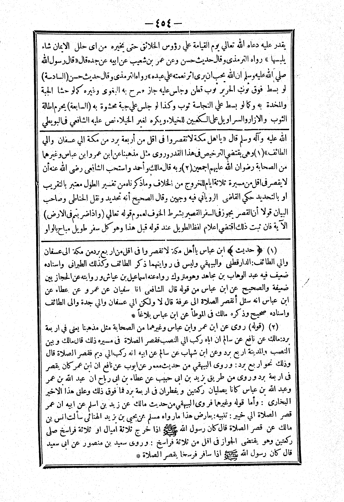 الله عليه وسلم قال " يا اهل مكة لا تقصروا في اقل من أربعة برد من مكة الي عسفان والي الطائف " وهو يقتضي الترخيص في هذا القدر وروى مثل مذهبنا عن ابن عمر وابن عباس وغيرهما من الصحابة رضوان الله عليهم اجمعين وبه قال مالك وأحمد واستحب الشافعي رضى الله عنه أن لا يقصر في اقل من مسيرة ثلاثة ايام للخروج من الخلاف وما ذكرناه من تفسير الطول معتبر بالتقريب أو بالتحديد حكي القاضى الروياني فيه وجهين وقال الصحيح أنه تحديد ونقل الحناطى وصاحب البيان قولا أن القصر يجوز في السفر القصير بشرط الخوف لعموم قوله تعالي (وإذا ضربتم في الارض) الآية فان ثبت ذلك اقتضي اعلام لفظ الطويل عند قوله قبل هذا وهو كل سفر طويل مباح بالواو