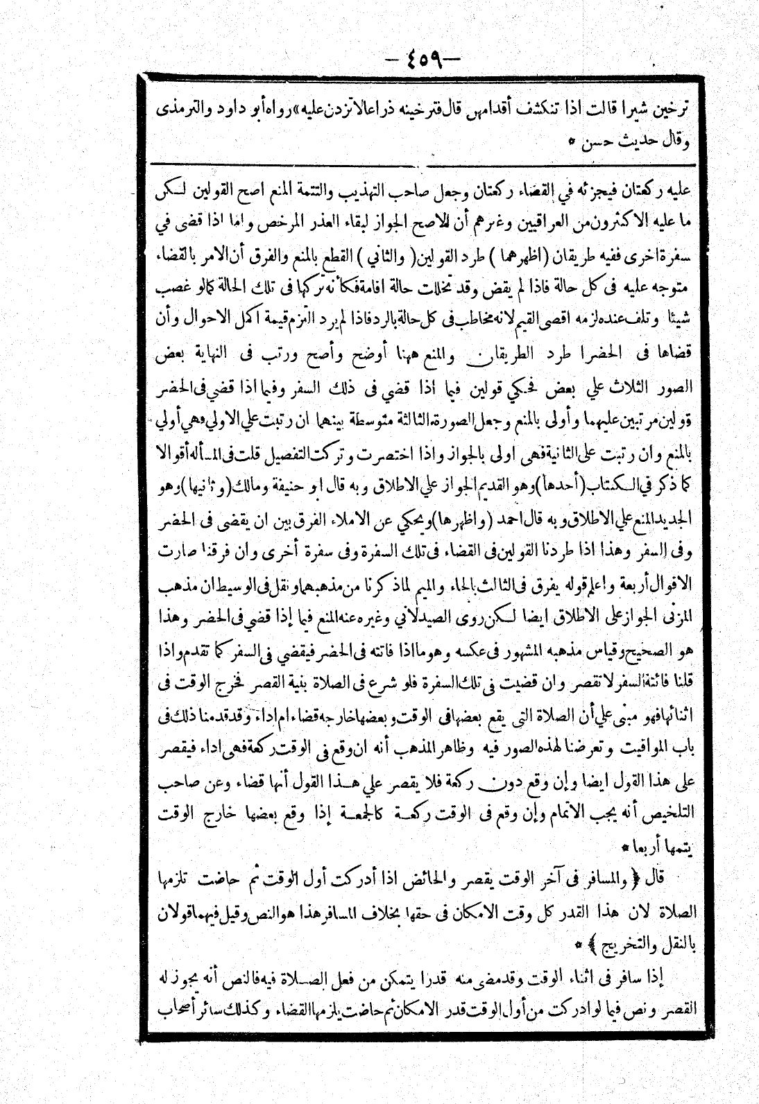 الصور الثلاث علي بعض فحكي قولين فيما إذا قضي في ذلك السفر وفيما إذا قضي في الحضر قولين مرتبين عليهما وأولى بالمنع وجعل الصورة الثالثة متوسطة بينهما ان رتبت علي الاولي فهي أولي بالمنع وان رتبت على الثانية فهى اولى بالجواز وإذا اختصرت وتركت التفصيل قلت في المسألة أقوالا كما ذكر في الكتاب (أحدها) وهو القديم الجواز علي الاطلاق وبه قال أبو حنيفة ومالك (وثانيها) وهو الجديد المنع علي الاطلاق وبه قال احمد (واظهرها) ويحكي عن الاملاء الفرق بين ان يقضى في الحضر وفى السفر وهذا إذا طردنا القولين في القضاء في تلك السفرة وفى سفرة أخرى وان فرقنا صارت الاقوال أربعة واعلم قوله يفرق في الثالث بالحاء والميم لما ذكرنا من مذهبهما ونقل في الوسيط ان مذهب المزني الجواز على الاطلاق ايضا لكن روى الصيدلاني وغيره عنه المنع فيما إذا قضي في الحضر وهذا هو الصحيح وقياس مذهبه المشهور في عكسه وهو ما إذا فاتته في الحضر فيقضي في السفر كما تقدم وإذا قلنا فائتة السفر لا تقصر وان قضيت في تلك السفرة فلو شرع في الصلاة بنية القصر فخرج الوقت في اثنائها فهو مبنى علي أن الصلاة التى يقع بعضها في الوقت وبعضها خارجه قضاء ام اداء وقد قدمنا ذلك في باب المواقيت وتعرضنا لهذه الصور فيه وظاهر المذهب أنه ان وقع في الوقت ركعة فهى اداء فيقصر على هذا القول ايضا وإن وقع دون ركعة فلا يقصر علي هذا القول أنها قضاء وعن صاحب التلخيص أنه يجب الاتمام وإن وقع في الوقت ركعة كالجمعة إذا وقع بعضها خارج الوقت يتمها أربعا * قال (والمسافر في آخر الوقت يقصر والحائض إذا أدركت أول الوقت ثم حاضت تلزمها الصلاة لان هذا القدر كل وقت الامكان في حقها بخلاف المسافر هذا هو النص وقيل فيهما قولان بالنقل والتخريج) * إذا سافر في اثناء الوقت وقد مضى منه قدرا يتمكن من فعل الصلاة فيه فالنص أنه يجوز له القصر ونص فيما لو ادركت من أول الوقت قدر الامكان ثم حاضت يلزمها القضاء وكذلك سائر أصحاب