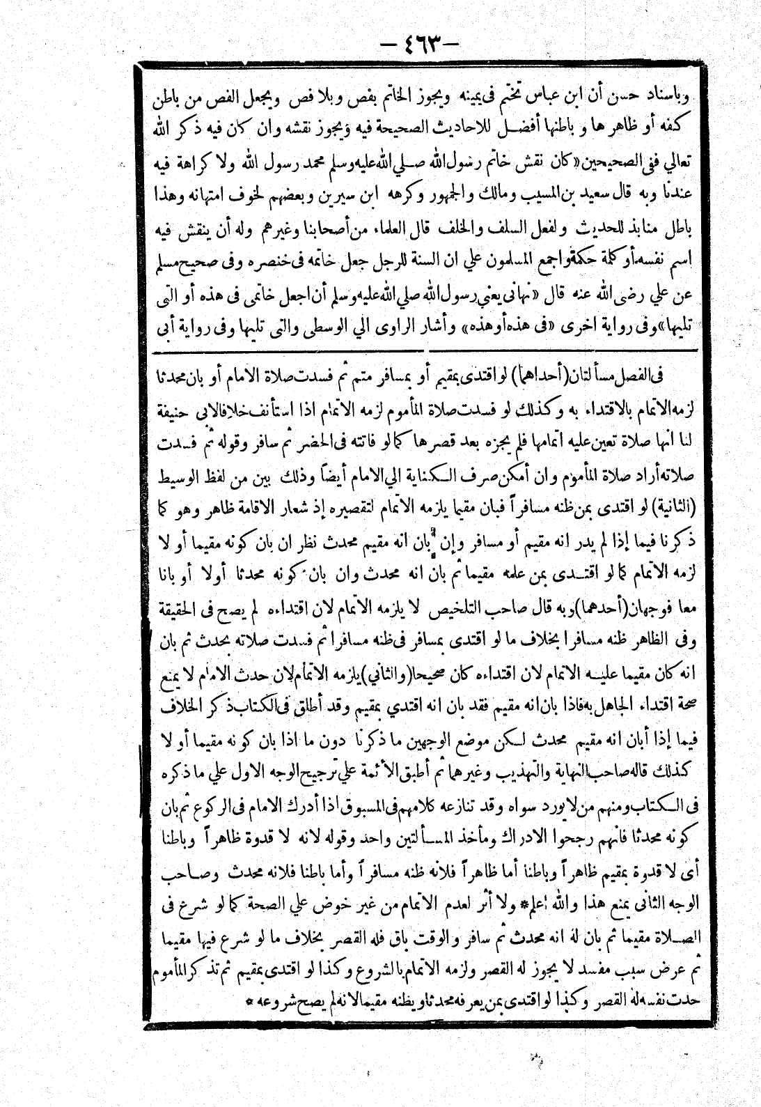 في الفصل مسألتان (أحداهما) لو اقتدى بمقيم أو بمسافر متم ثم فسدت صلاة الامام أو بان محدثا لزمه الاتمام بالاقتداء به وكذلك لو فسدت صلاة المأموم لزمه الاتمام إذا استأنف خلافا لابي حنيفة لنا انها صلاة تعين عليه اتمامها فلم يجزه بعد قصرها كما لو فاتته في الحضر ثم سافر وقوله ثم فسدت صلاته أراد صلاة المأموم وان أمكن صرف الكناية الي الامام أيضا وذلك بين من لفظ الوسيط (الثانية) لو اقتدى بمن ظنه مسافرا فبان مقيما يلزمه الاتمام لتقصيره إذ شعار الاقامة ظاهر وهو كما ذكرنا فيما إذا لم يدر انه مقيم أو مسافر وإن بان انه مقيم محدث نظر ان بان كونه مقيما أو لا لزمه الاتمام كما لو اقتدى بمن علمه مقيما ثم بان انه محدث وان بان كونه محدثا أولا أو بانا معا فوجهان (أحدهما) وبه قال صاحب التلخيص لا يلزمه الاتمام لان اقتداءه لم يصح في الحقيقة وفى الظاهر ظنه مسافرا بخلاف ما لو اقتدى بمسافر في ظنه مسافرا ثم فسدت صلاته بحدث ثم بان انه كان مقيما عليه الاتمام لان اقتداءه كان صحيحا (والثاني) يلزمه الاتمام لان حدث الامام لا يمنع صحة اقتداء الجاهل به فإذا بان انه مقيم فقد بان انه اقتدي بمقيم وقد أطلق في الكتاب ذكر الخلاف فيما إذا أبان انه مقيم محدث لكن موضع الوجهين ما ذكرنا دون ما إذا بان كونه مقيما أو لا كذلك قاله صاحب النهاية والتهذيب وغيرهما ثم أطبق الائمة علي ترجيح الوجه الاول علي ما ذكره في الكتاب ومنهم من لا يورد سواه وقد تنازعه كلامهم في المسبوق إذا أدرك الامام في الركوع ثم بان كونه محدثا فانهم رجحوا الادراك ومأخذ المسألتين واحد وقوله لانه لا قدوة ظاهرا وباطنا أي لا قدوة بمقيم ظاهرا وباطنا أما ظاهرا فلانه ظنه مسافرا وأما باطنا فلانه محدث وصاحب الوجه الثاني يمنع هذا والله اعلم * ولا أثر لعدم الاتمام من غير خوض علي الصحة كما لو شرع في الصلاة مقيما ثم بان له انه محدث ثم سافر والوقت باق فله القصر بخلاف ما لو شرع فيها مقيما ثم عرض سبب مفسد لا يجوز له القصر ولزمه الاتمام بالشروع وكذا لو اقتدى بمقيم ثم تذكر المأموم حدت نفسه له القصر وكذا لو اقتدى بمن يعرفه محدثا ويظنه مقيما لانه لم يصح شروعه *