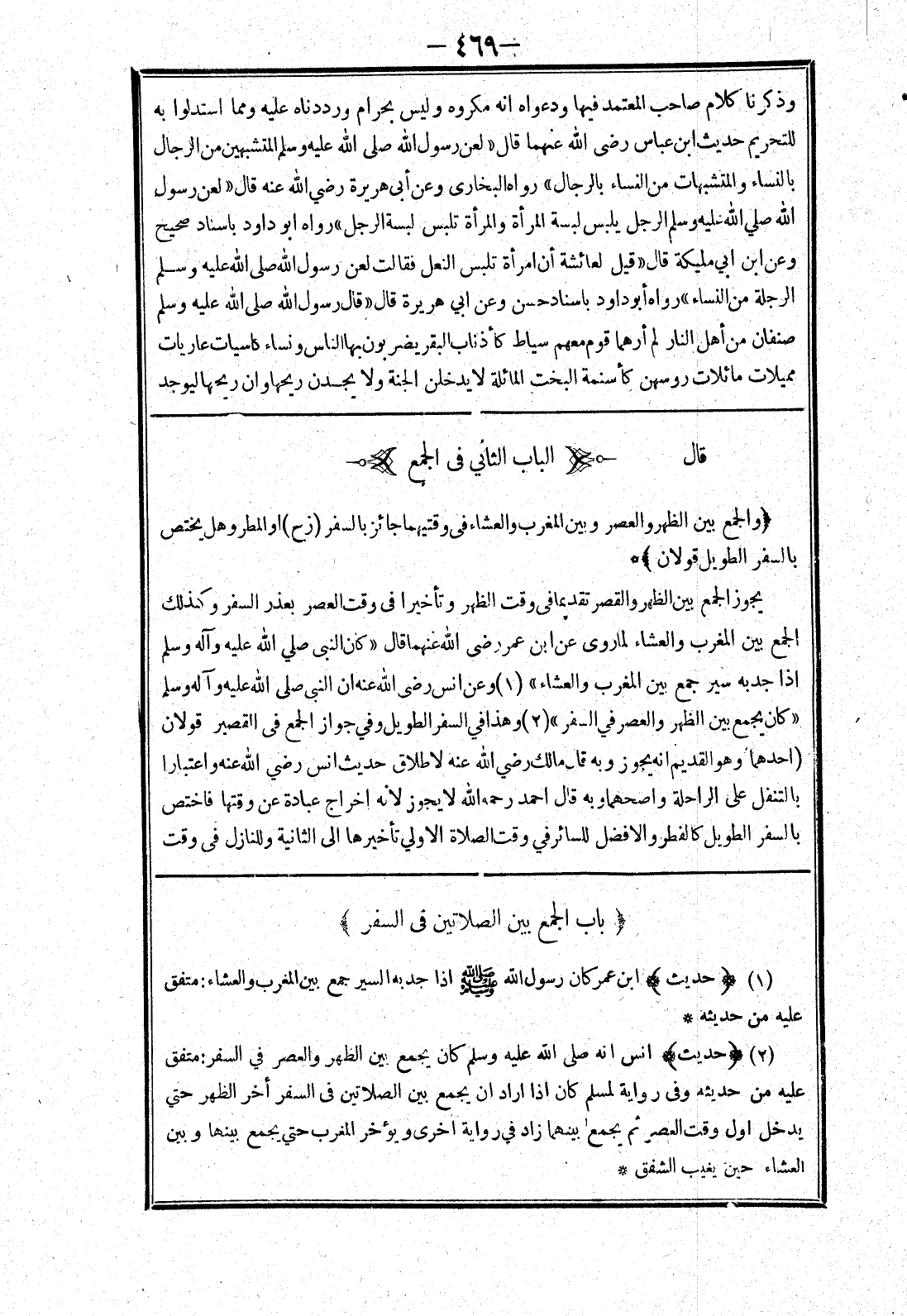 قال * (الباب الثاني في الجمع) (والجمع بين الظهر والعصر وبين المغرب والعشاء في وقتيهما جائز بالسفر (زح) أو المطر وهل يختص بالسفر الطويل قولان) * يجوز الجمع بين الظهر والعصر تقديما في وقت الظهر وتأخيرا في وقت العصر بعذر السفر وكذلك الجمع بين المغرب والعشاء لما روى عن ابن عمر رضى الله عنهما قال " كان النبي صلي الله عليه وسلم إذا جدبه سير جمع بين المغرب والعشاء " وعن انس رضى الله عنه ان النبي صلى الله عليه وسلم " كان يجمع بين الظهر والعصر في السفر " وهذا في السفر الطويل وفي جواز الجمع في القصير قولان (احدهما وهو القديم انه يجوز وبه قال مالك رضي الله عنه لاطلاق حديث انس رضي الله عنه واعتبارا بالتنفل على الراحلة واصحهما وبه قال احمد رحمه الله لا يجوز لانه اخراج عبادة عن وقتها فاختص بالسفر الطويل كالفطر والافضل للسائر في وقت الصلاة الاولي تأخيرها إلى الثانية وللنازل في وقت