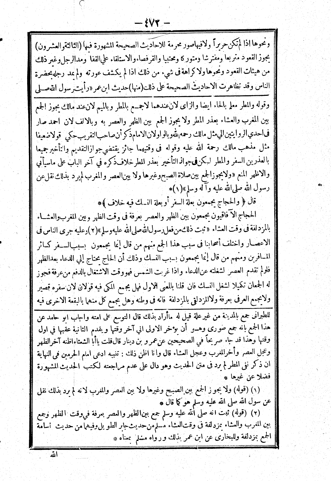 وقوله والمطر معلم بالحاء ايضا والزاى لان عندهما لا جمع بالمطر وبالميم لان عند مالك يجوز الجمع بين المغرب والعشاء بعذر المطر ولا يجوز الجمع بين الظهر والعصر به وبالالف لان احمد صار في احدي الروايتين الي مثل مالك رحمه الله وبالواو لان الامام ذكر أن صاحب التقريب حكي قولا ضعيفا مثل مذهب مالك رحمة الله عليه وقوله في وقتيهما جائز يقتضي جواز التقديم والتأخير جميعا بالعذرين السفر والمطر لكن في جواز التأخير بعذر المطر خلاف ذكره في آخر الباب على ما سيأتي والاظهر المنع " ولا يجوز الجمع بين صلاة الصبح وغيرها ولا بين العصر والمغرب لم يرد بذلك نقل عن رسول الله صلى الله عليه وسلم " * قال (والحجاج يجمعون بعلة السفر أو بعلة النسك فيه خلاف) * الحجاج الآفاقيون يجمعون بين الظهر والعصر بعرفة في وقت الظهر وبين المغرب والعشاء بالمزدلفة في وقت العشاء " ثبت ذلك من فعل رسول الله صلى الله عليه وسلم " وعليه جرى الناس في الاعصار واختلف أصحابنا في سبب هذا الجمع منهم من قال إنما يجمعون بسبب السفر كسائر المسافرين ومنهم من قال إنما يجمعون بسبب النسك وذلك أن الحاج يحتاج إلي الدعاء بعد الظهر فلو لم تقدم العصر لشغلته عن الدعاء وإذا غربت الشمس فهو وقت الاشتغال بالدفع من عرفة فجوز له الجمعان تكميلا لشغل النسك فان قلنا بالمعنى الاول فهل يجمع المكى فيه قولان لان سفره قصى ولا يجمع العرفي بعرفة ولا المزدلفى بالمزدلفة فانه في وطنه وهل يجمع كل منهما بالبقعة الاخرى فيه