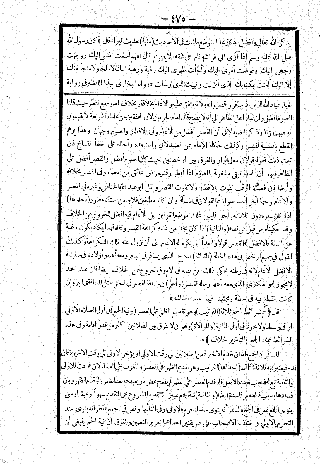 خيار عباد الله الذين إذا سافروا قصروا " ولانه متفق عليه والاتمام بخلافه وبخلاف الصوم مع الفطر حيث قلنا الصوم افضل وان صار اهل الظاهر الي انه لا يصح قال امام الحرمين لان المحققين من علماء الشريعة لا يقيمون لمذهبهم وزنا وذكر الصيدلانى أن القصر أفضل من الاتمام وفى الافطار والصوم وجهان وهذا يوهم القطع بافضلية القصر وكذلك حكاه الامام عن الصيدلاني واستبعده وأحاله علي خطأ النساخ فان ثبت ذلك فقوله قولان معلم بالواو والفرق بين الرخصتين حيث كان الصوم أفضل والقصر أفضل علي الظاهر فيهما أن الذمة تبقى مشغولة بالصوم إذا أفطر وقد يعرض عائق من القضاء وفى القصر بخلافه وأيضا فان فضيلة الوقت تفوت بالافطار ولا تفوت بالقصر ونقل أبو عبد الله الحناطى وغيره في القصر والاتمام وجها آخر انهما سواء ثم القولان في المسألة وان كانا مطلقين فلا بد من استثناء صور (أحداها) إذا كان سفره دون ثلاث مراحل فليس ذلك موضع القولين بل الاتمام فيه افضل للخروج عن الخلاف وقد حكيناه من قبل عن نصه (والثانية) إذا كان يجد من نفسه كراهة القصر وثقله فهذا يكاد يكون رغبة عن السنة فالافضل له القصر قولا واحدا بل يكره له الاتمام إلى أن تزول عنه تلك الكراهة وكذلك القول في جميع الرخص في هذه الحالة (الثالثة) الملاح الذى يسافر في البحر ومعه أهله وأولاده في سفينته الافضل الاتمام لانه في وطنه يحكى ذلك عن نصه في الام وفيه خروج عن الخلاف ايضا فان عند احمد لا يجوز له وللمكارى الذى معه أهله وماله القصر (وأعلم) ان مسافة القصر في البحر مثل المسافة في البر وان