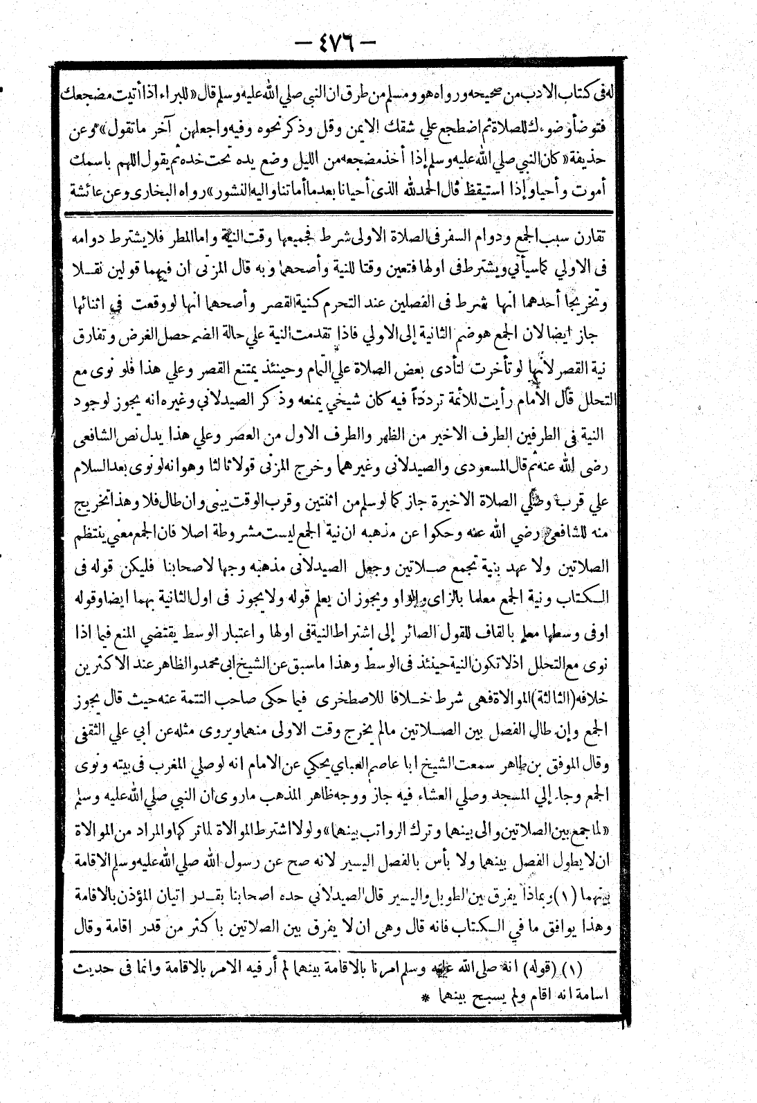 تقارن سبب الجمع ودوام السفر في الصلاة الاولى شرط فجميعها وقت النية واما المطر فلا يشترط دوامه في الاولي كما سيأتي ويشترط في اولها فتعين وقتا للنية وأصحهما وبه قال المزني ان فيهما قولين نقلا وتخريجا أحدهما انها شرط في الفصلين عند التحرم كنية القصر وأصحهما انها لو وقعت في اثنائها جاز ايضا لان الجمع هو ضم الثانية إلى الاولي فإذا تقدمت النية علي حالة الضم حصل الغرض وتفارق نية القصر لانها لو تأخرت لتأدى بعض الصلاة علي التمام وحينئذ يمتنع القصر وعلي هذا فلو نوى مع التحلل قال الامام رأيت للائمة ترددا فيه كان شيخي يمنعه وذكر الصيدلاني وغيره انه يجوز لوجود النية في الطرفين الطرف الاخير من الظهر والطرف الاول من العصر وعلي هذا يدل نص الشافعي رضى الله عنه ثم قال المسعودي والصيدلانى وغيرهما وخرج المزني قولا ثالثا وهو انه لو نوى بعد السلام علي قرب وصلي الصلاة الاخيرة جاز كما لو سلم من اثنتين وقرب الوقت يبنى وان طال فلا وهذا تخريج منه للشافعي رضي الله عنه وحكوا عن مذهبه ان نية الجمع ليست مشروطة اصلا فان الجمع معني ينتظم الصلاتين ولا عهد بنية تجمع صلاتين وجعل الصيدلانى مذهبه وجها لاصحابنا فليكن قوله في
