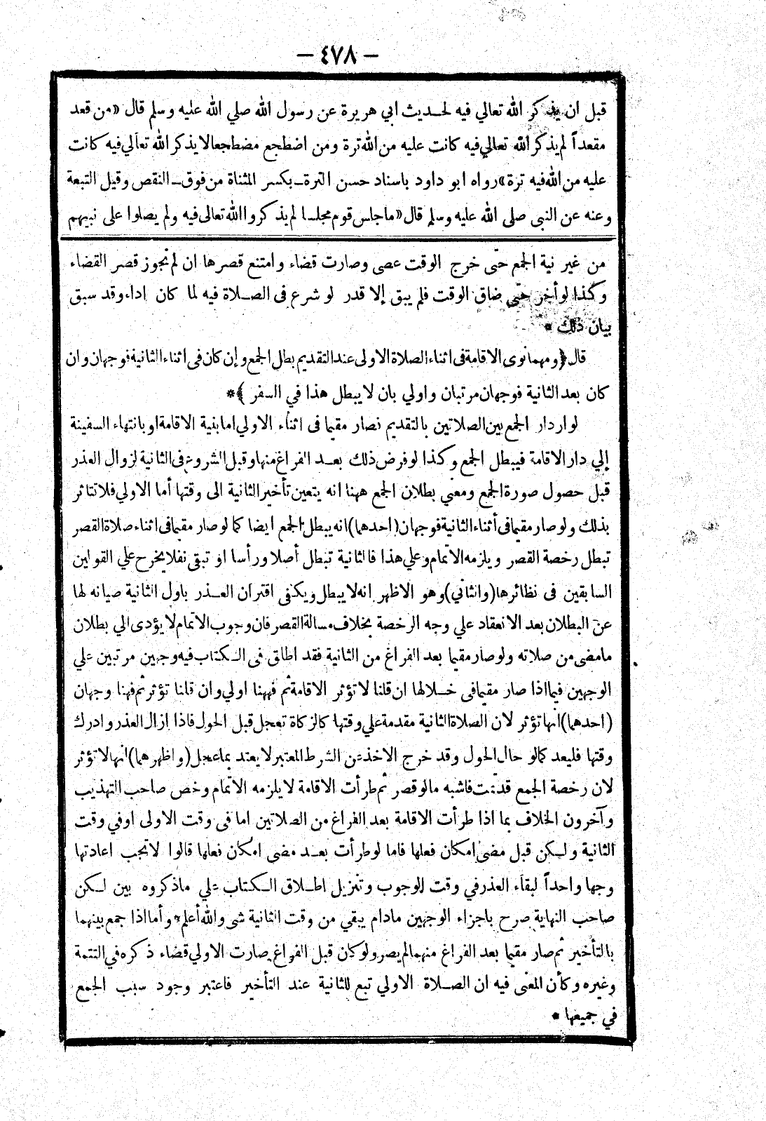 من غير نية الجمع حتى خرج الوقت عصى وصارت قضاء وامتنع قصرها ان لم تجوز قصر القضاء وكذا لو أخر حتى ضاق الوقت فلم يبق إلا قدر لو شرع في الصلاة فيه لما كان اداء وقد سبق بيان ذلك * قال (ومهما نوى الاقامة في اثناء الصلاة الاولى عند التقديم بطل الجمع وإن كان في اثناء الثانية فوجهان وان كان بعد الثانية فوجهان مرتبان واولي بان لا يبطل هذا في السفر) * لو اراد الجمع بين الصلاتين بالتقديم فصار مقيما في اثناء الاولي اما بنية الاقامة أو بانتهاء السفينة إلي دار الاقامة فيبطل الجمع وكذا لو فرض ذلك بعد الفراغ منها وقبل الشروع في الثانية لزوال العذر