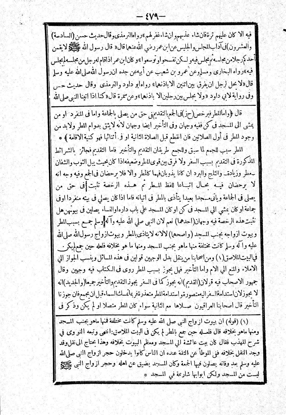 المذكورة في التقديم بسبب السفر ولا فرق بين قوى المطر وضعيفه إذا كان بحيث يبل الثوب والشفان مطر وزيادة والثلج والبرد ان كانا يذوبان فهما كالمطر والا فلا يرخصان في الجمع وفيه وجه انه لا يرخصان فيه بحال اتباعا للفظ المطر ثم هذه الرخصة تثبت في حق من يصلى في الجماعة ويأتى مسجدا بعيدا يتأذى بالمطر في اتيانه فاما إذا كان يصلي في بيته منفردا أو في جماعة أو كان يمشي الي المسجد في كن أو كان المسجد علي باب داره أو النساء يصلين في بيوتهن هل نثبت هذه الرخصة فيه وجهان (احدهما) نعم لان النبي صلي الله عليه وسلم جمع بسبب المطر وبيوت ازواجه بجنب المسجد (واصحهما) لا لانه لا يتاذى بالمطر وبيوت ازواج رسول الله صلى الله عليه وسلم كانت مختلفة منها ما هو بجنب المسجد ومنها ما هو بخلافه فلعله حين جمع لم يكن في البيت الملاصق ومن اصحابنا من ينقل بدل الوجهين قولين في هذه المسائل وينسب الجواز الي الاملاء والمنع الي الام واما التأخير فهل يجوز بسبب المطر روى في الكتاب فيه وجهين وقال جمهور الاصحاب فيه قولان (القديم) انه يجوز كما في السفر يجوز التقديم والتأخير جميعا (والجديد) انه لا يجوز لان استدامة السفر إليه متصورة واستدامة المطر متعذرة فربما تمسك السماء قبل ان يجمع فان جوزنا التأخير قال اصحابنا العراقيون صلاها مع الثانية سواء كان المطر متصلا أو لم يكن وذكر في