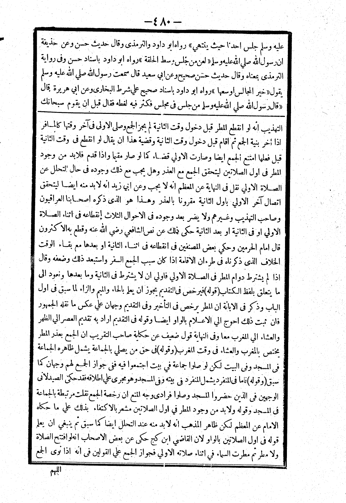 التهذيب انه لو انقطع المطر قبل دخول وقت الثانية لم يجز الجمع وصلى الاولى في آخر وقتها كالمسافر إذا اخر بنية الجمع ثم اقام قبل دخول وقت الثانية وقضية هذا ان يقال لو انقطع في وقت الثانية قبل فعلها امتنع الجمع ايضا وصارت الاولي قضاء كما لو صار مقيما وإذا قدم فلا بد من وجود المطر في اول الصلاتين ليتحقق الجمع مع العذر وهل يجب مع ذلك وجوده في حال التحلل عن الصلاة الاولي نقل في النهاية عن المعظم انه لا يجب وعن ابي زيد انه لا بد منه ايضا ليتحقق اتصال آخر الاولي باول الثانية مقرونا بالعذر وهذا هو الذى ذكره اصحابنا العراقيون وصاحب التهذيب وغيرهم ولا يضر بعد وجوده في الاحوال الثلاث إنقطاعه في أثناء الصلاة الاولي أو في الثانية أو بعد الثانية حكى ذلك عن نص الشافعي رضي الله عنه وقطع به الاكثرون