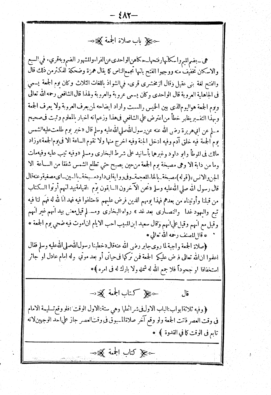 قال * (كتاب الجمعة) * (وفيه ثلاثة ابواب: الباب الاول في شرائطها وهي ستة: الاول الوقت: فلو وقع تسليمة الامام في وقت العصر فاتت الجمعة ولو وقع آخر صلاة المسبوق في وقت العصر جاز علي احد الوجهين لانه تابع في الوقت كما في القدوة)