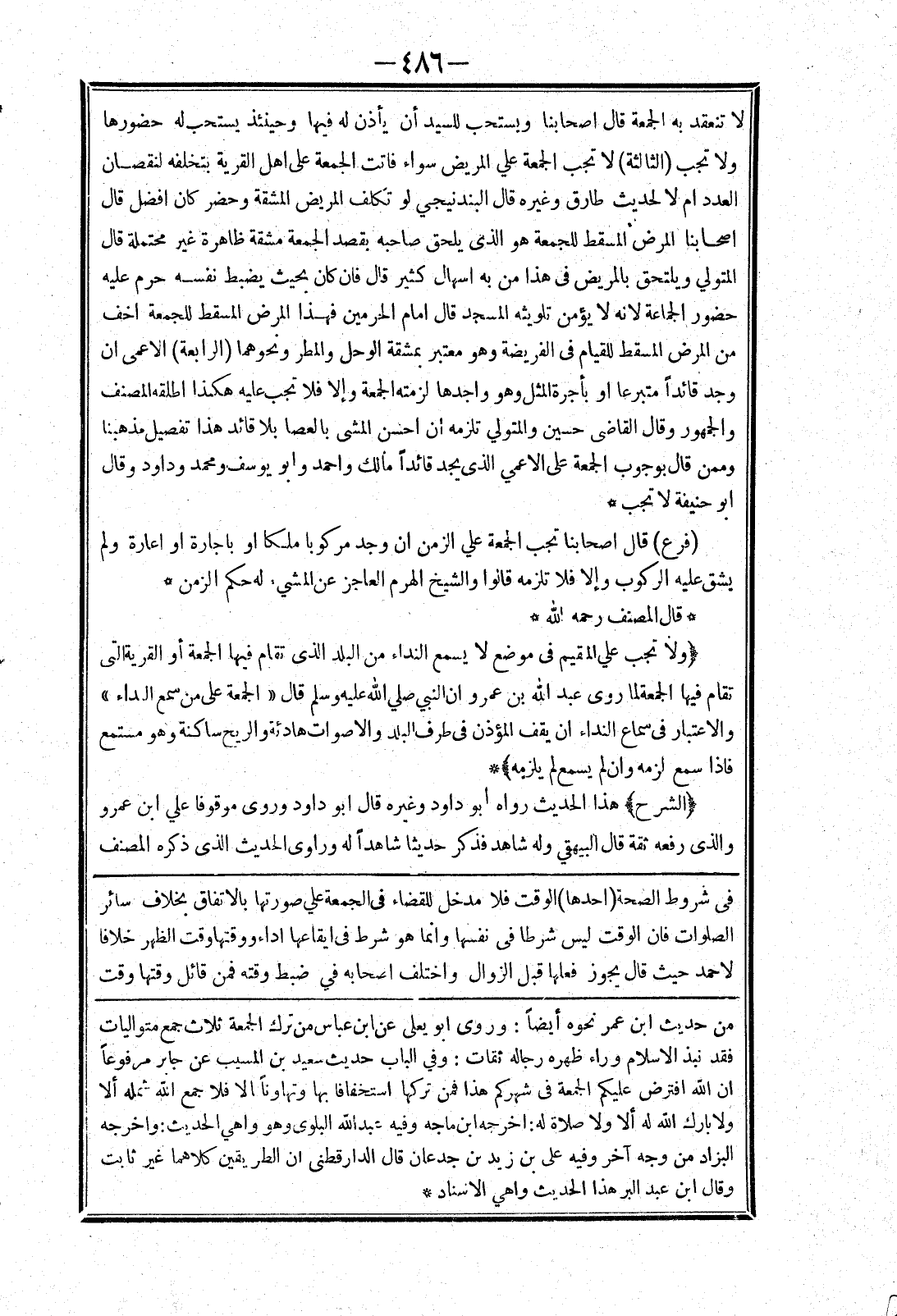 في شروط الصحة (احدها) الوقت فلا مدخل للقضاء في الجمعة علي صورتها بالاتفاق بخلاف سائر الصلوات فان الوقت ليس شرطا في نفسها وانما هو شرطه في ايقاعها اداء ووقتها وقت الظهر خلافا لاحمد حيث قال يجوز فعلها قبل الزوال واختلف اصحابه في ضبط وقته فمن قائل وقتها وقت